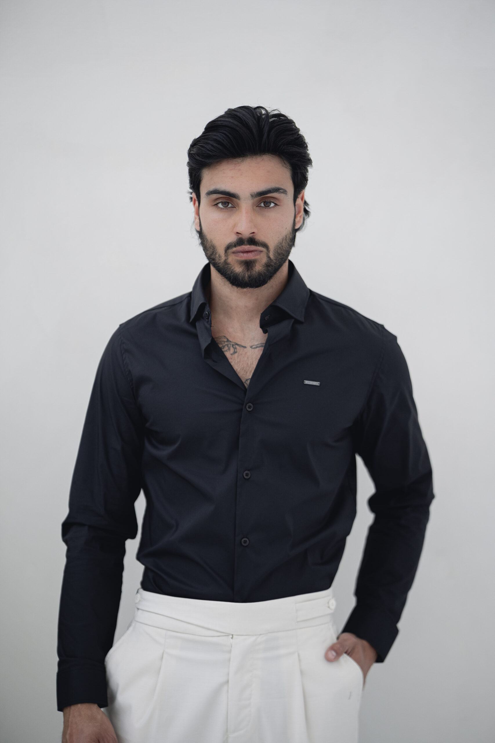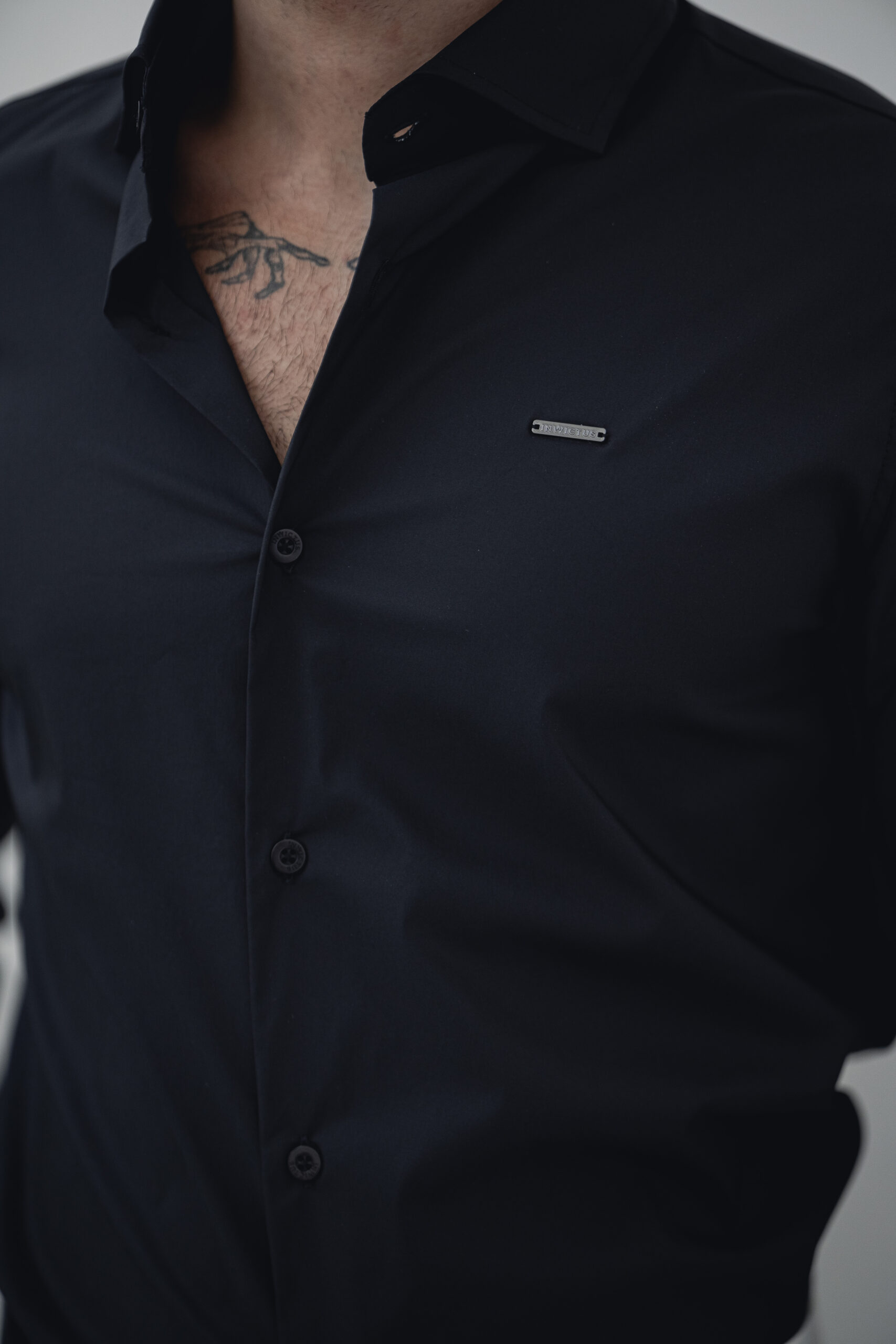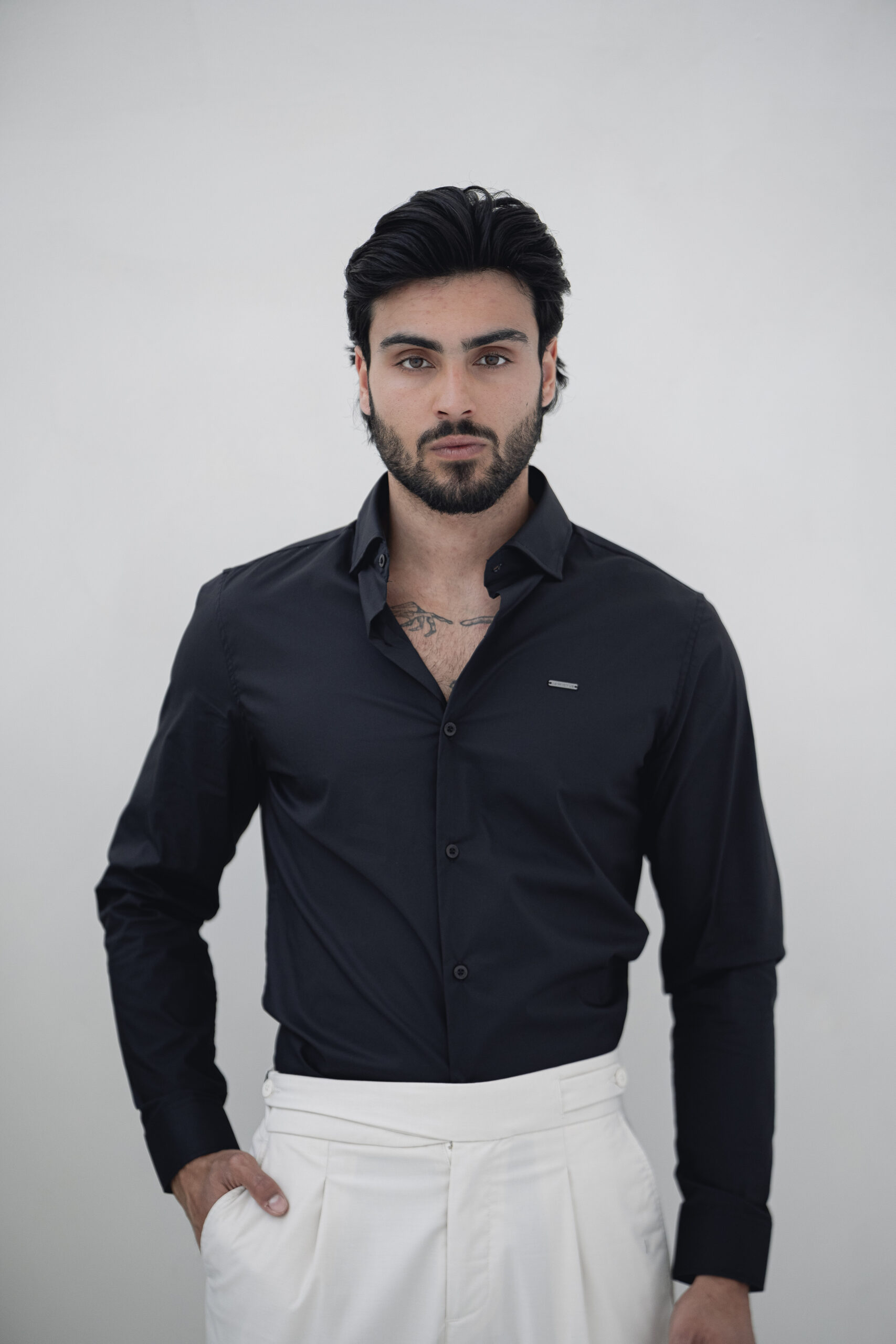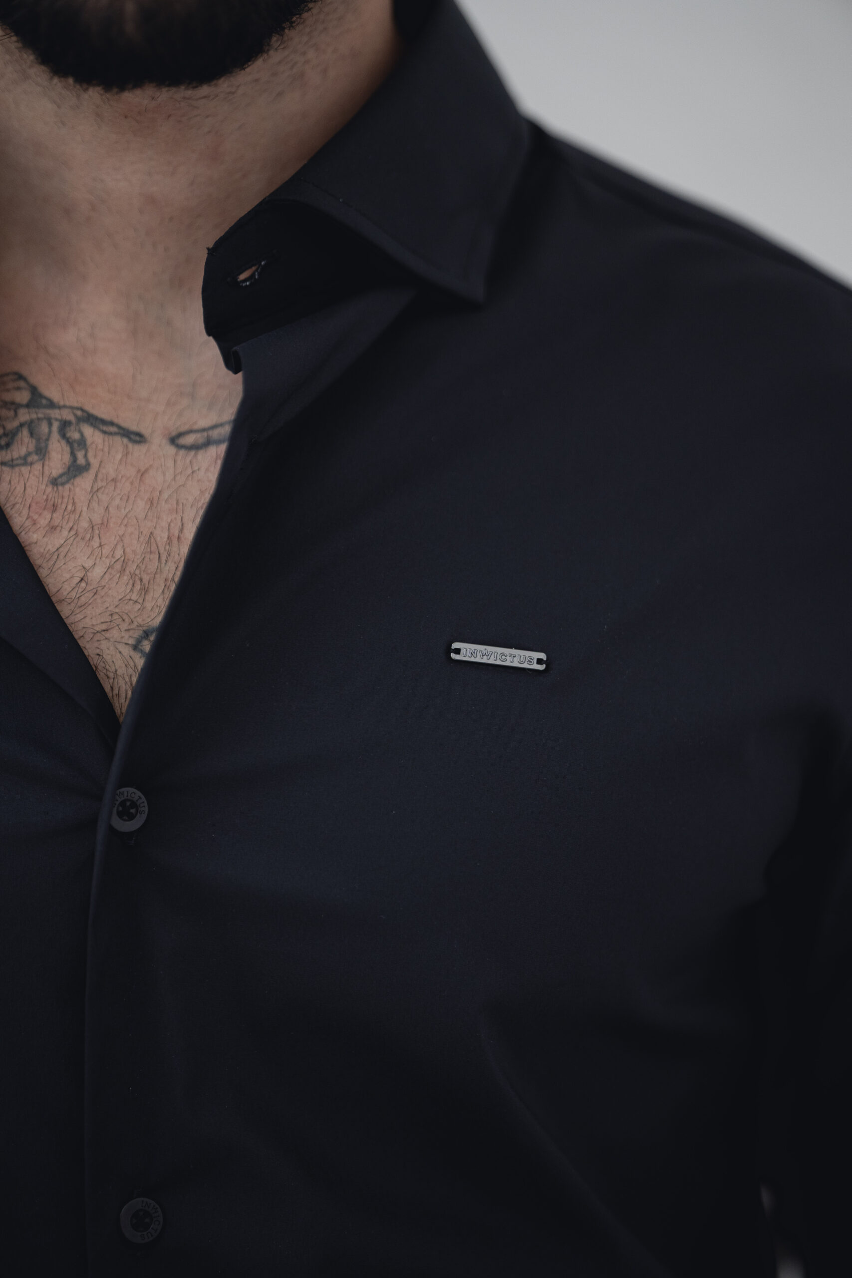Camisa preta slim fit para homem, sofisticada e versátil, ideal para eventos formais e looks premium contemporâneos. Com selo 100% Made in Portugal!
