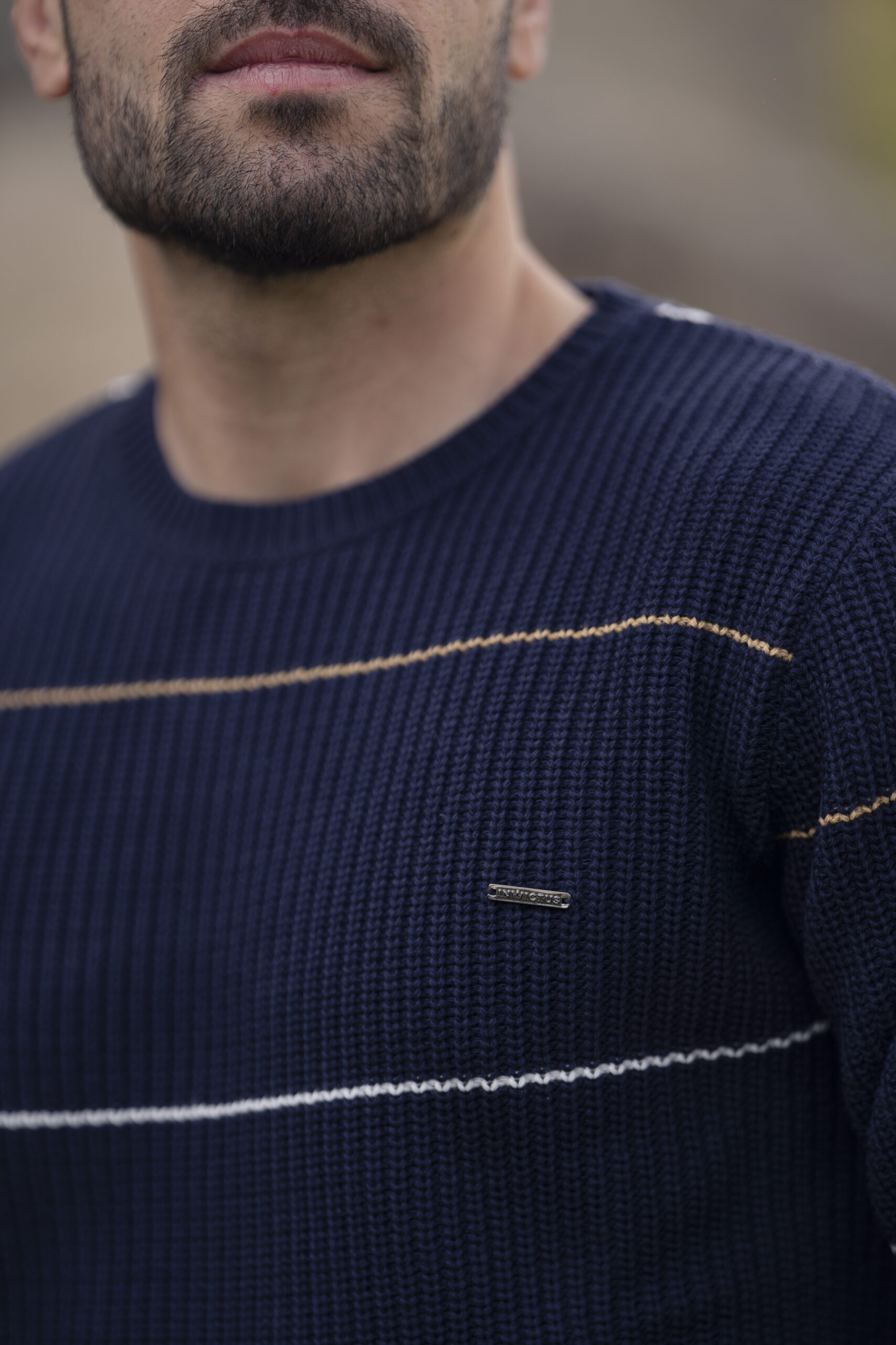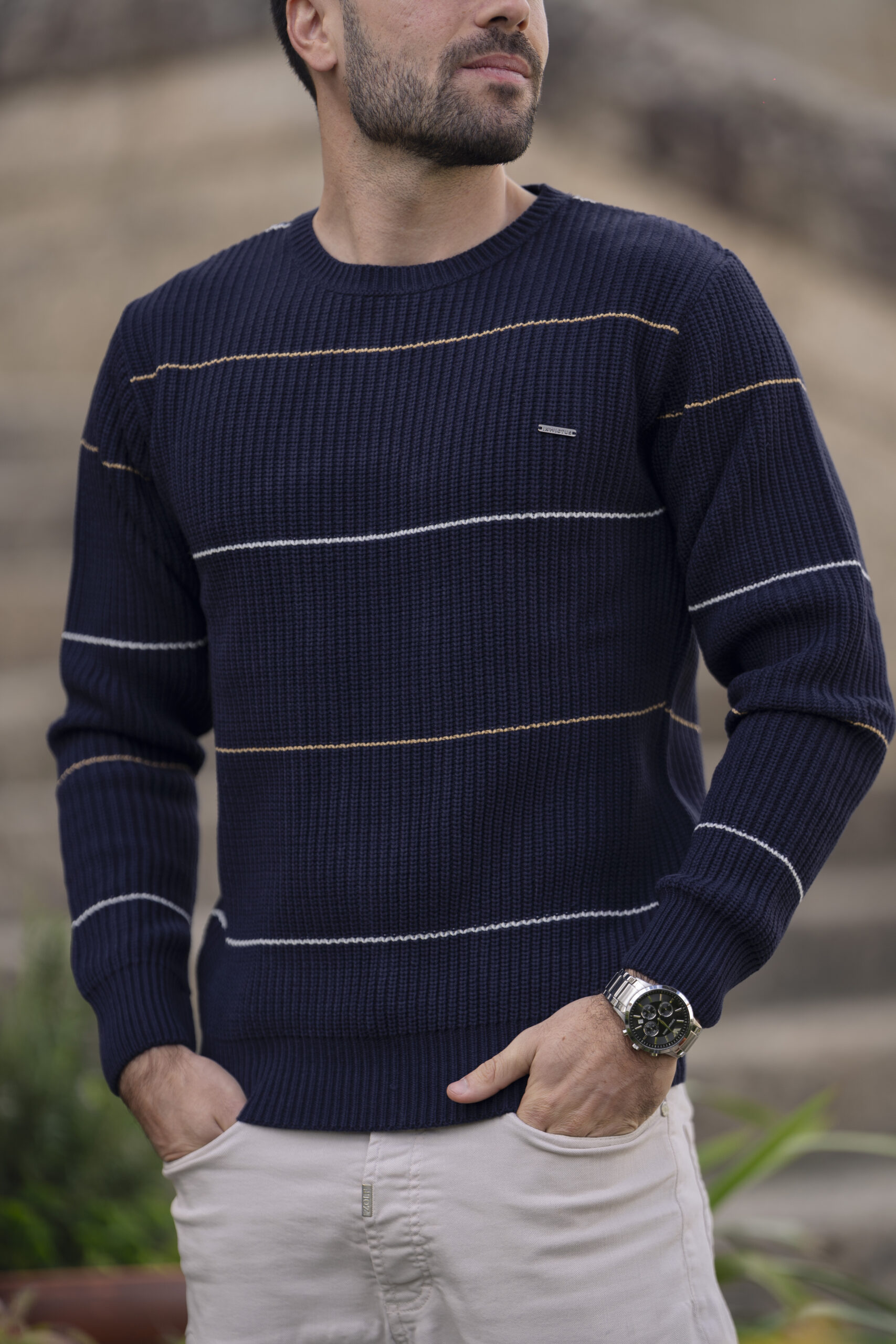 Camisola em malha texturada de tom azul, decorada com riscas subtis em azul-escuro e castanho. Ajuste confortável e design intemporal para combinar facilmente com qualquer guarda-roupa.
