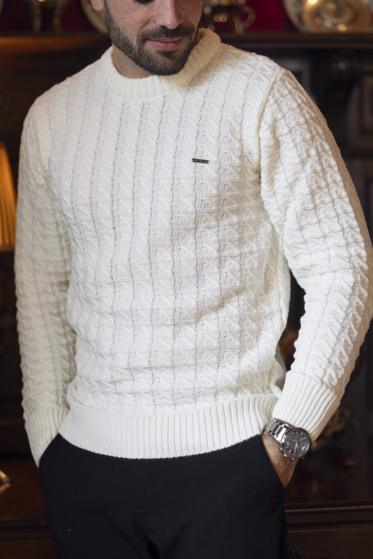 Camisola cru com padrão entrançado e acabamentos canelados na gola, punhos e cinta. Um modelo clássico que combina estilo e conforto.