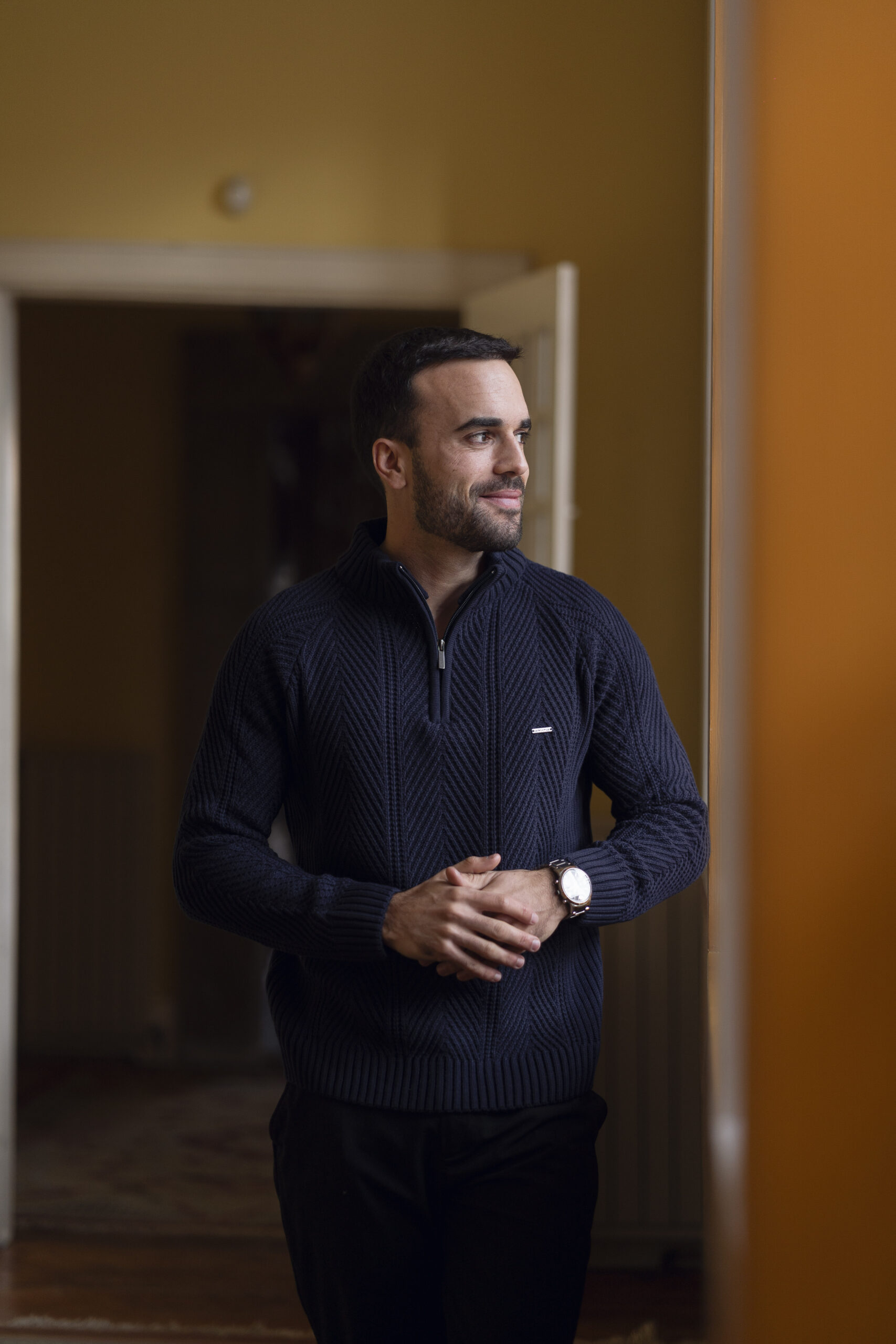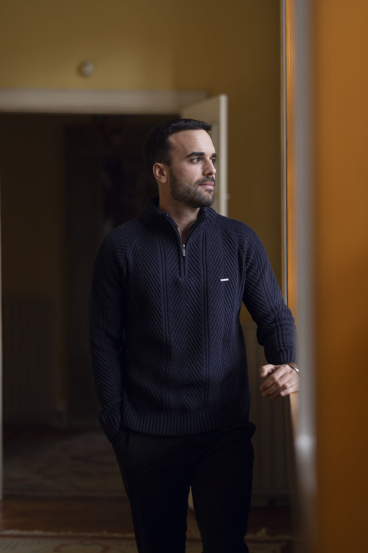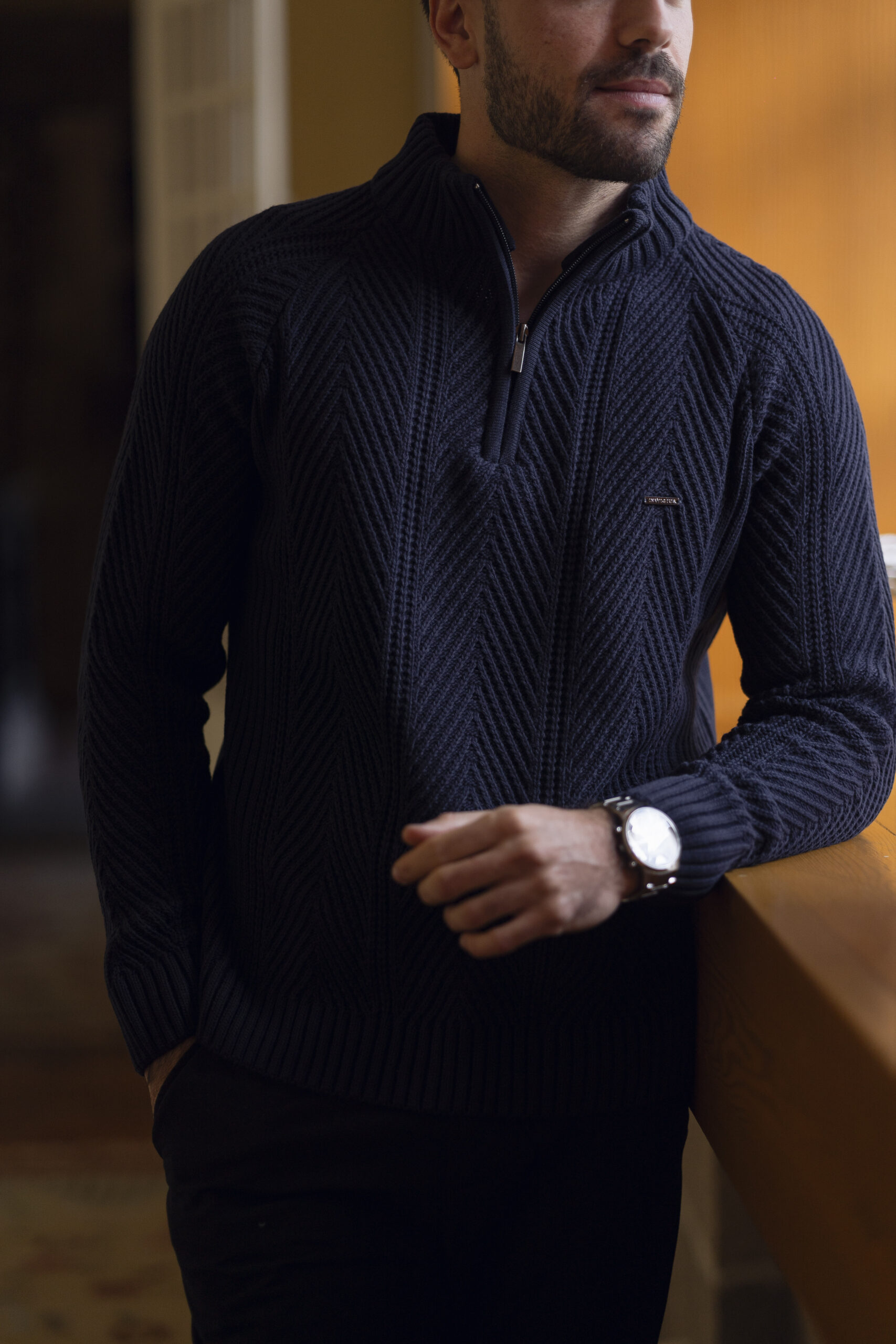 Camisola azul de meia-gola com fecho, confeccionada em malha texturada com padrão em espinha. Um modelo versátil, quente e elegante para o dia-a-dia.