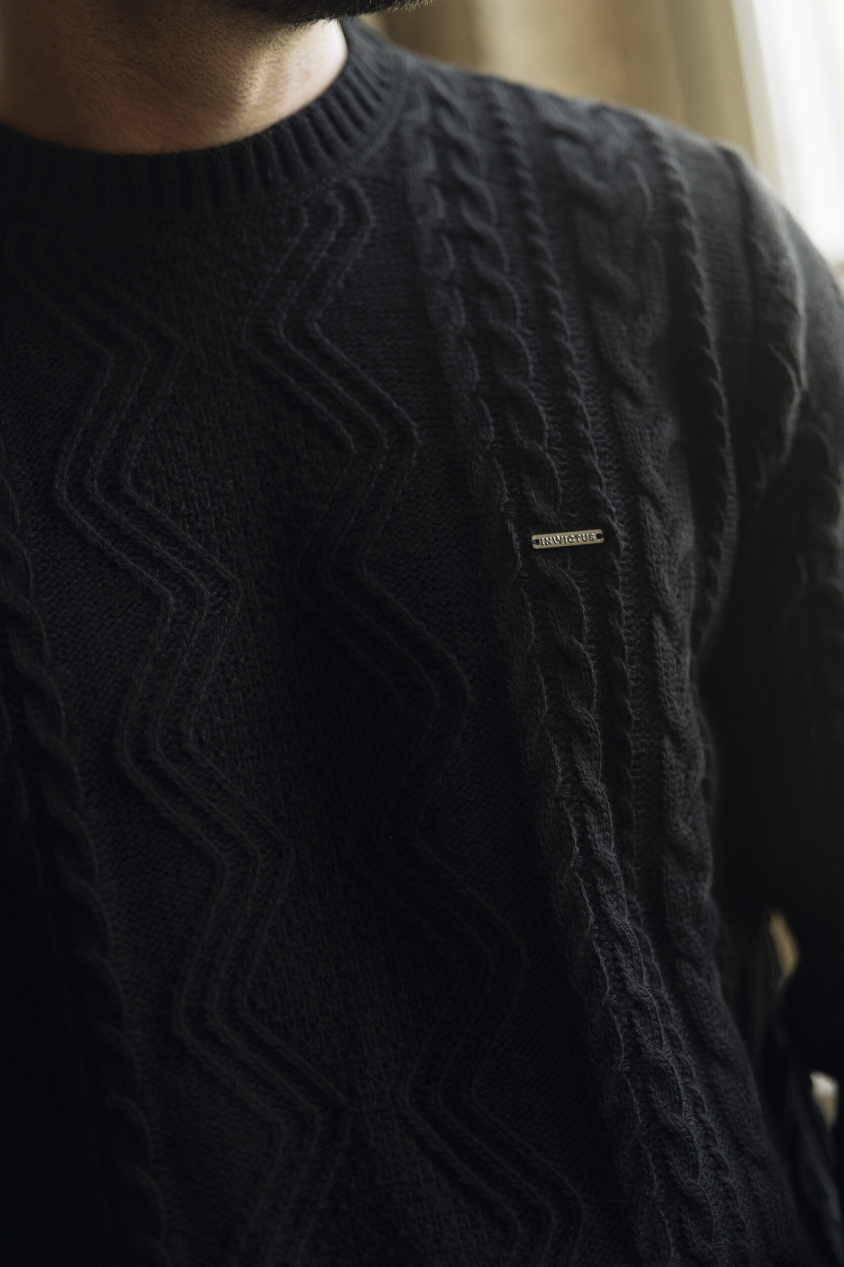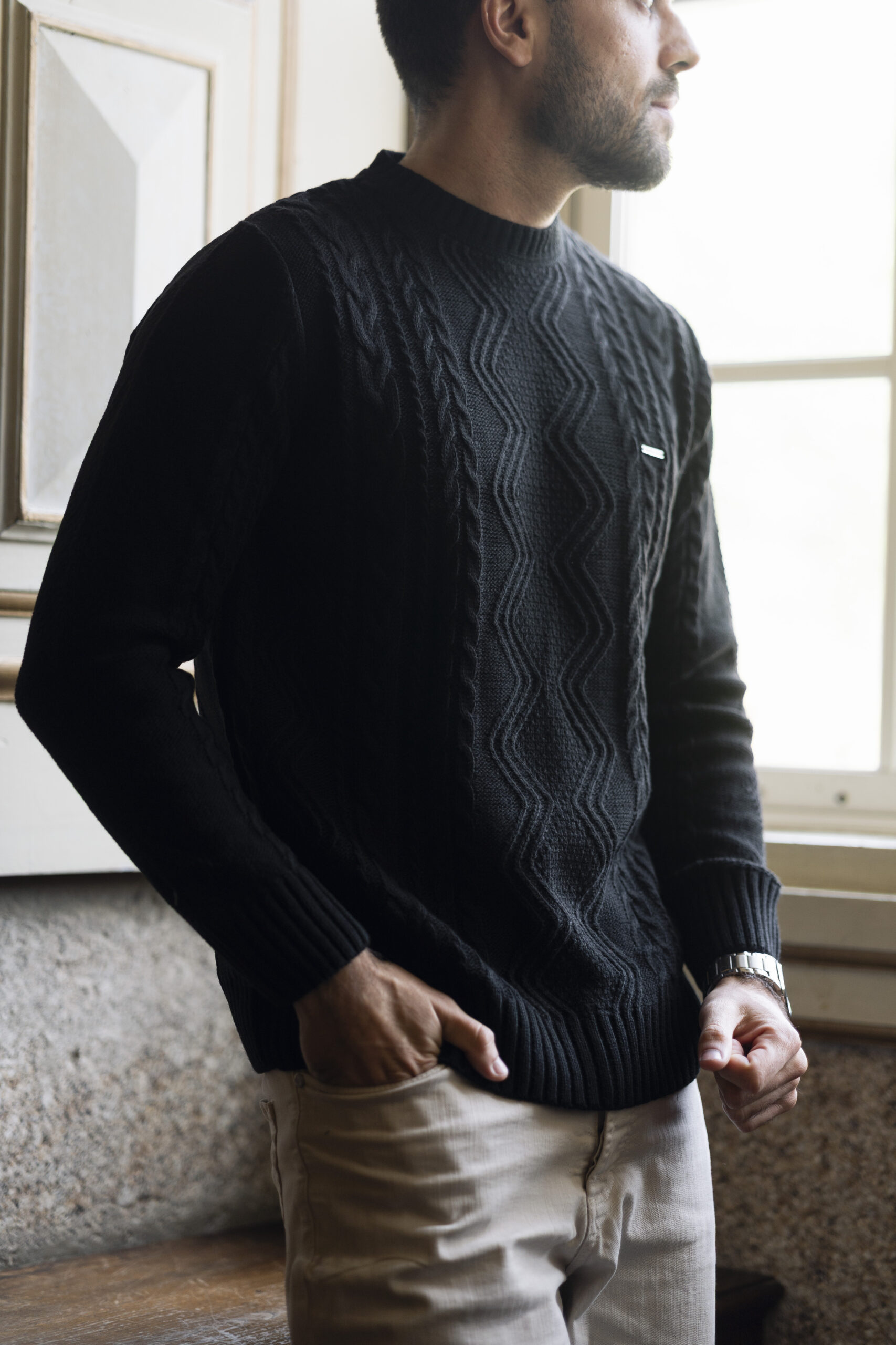 Camisola de malha tricotada em tom preto, com padrão clássico de tranças e detalhe texturado. Confortável e versátil, perfeita para os dias mais frios.