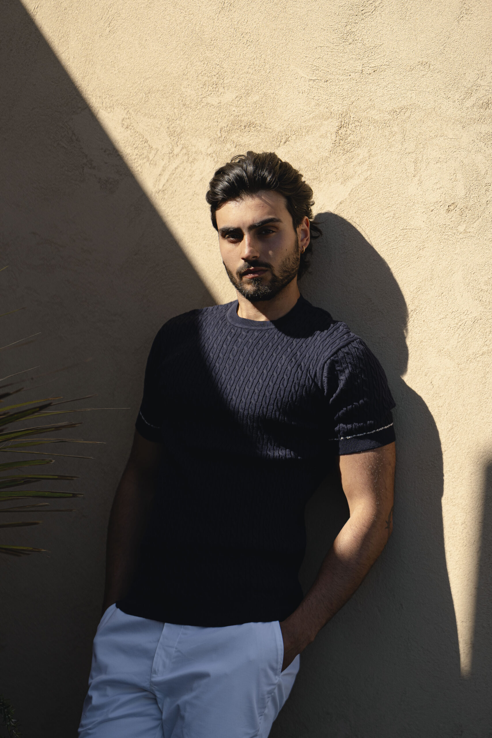Inspirada no estilo mediterrânico contemporâneo, a T Shirt entrançada azul combina sofisticação, leveza e conforto numa peça essencial para o guarda-roupa masculino de verão.