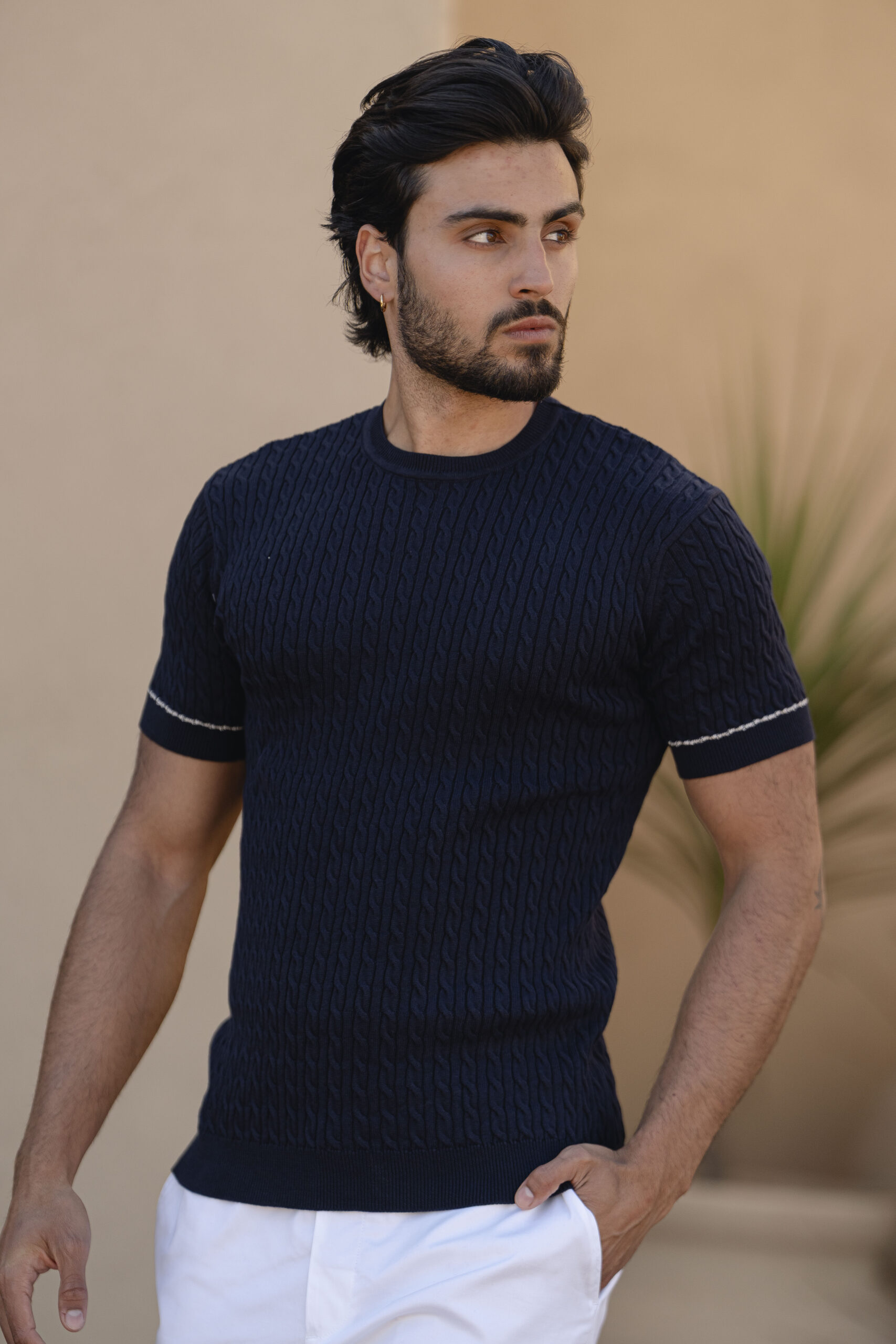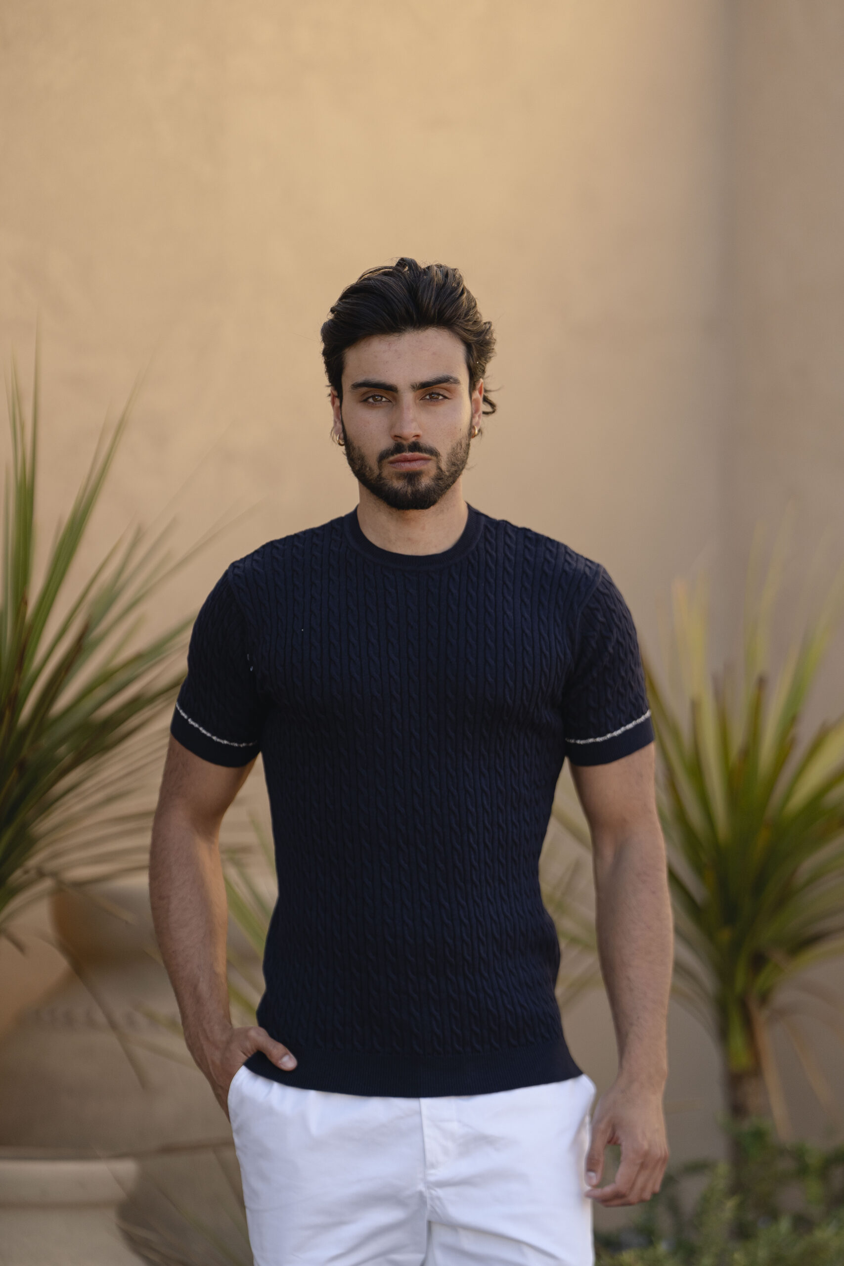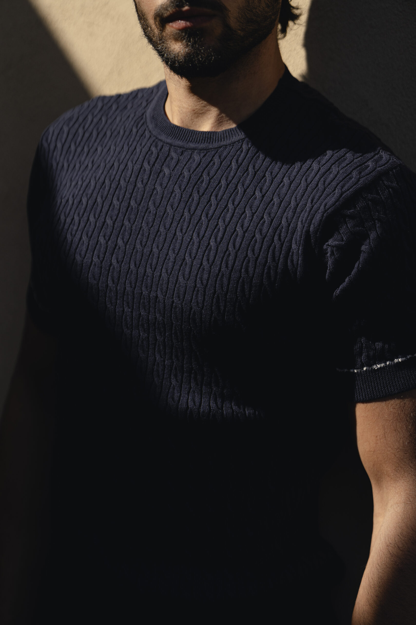 Camisola tricot azul com textura entrançada elegante, perfeita para um visual sofisticado e leve nos dias de verão. Uma peça premium para homens que valorizam estilo intemporal.