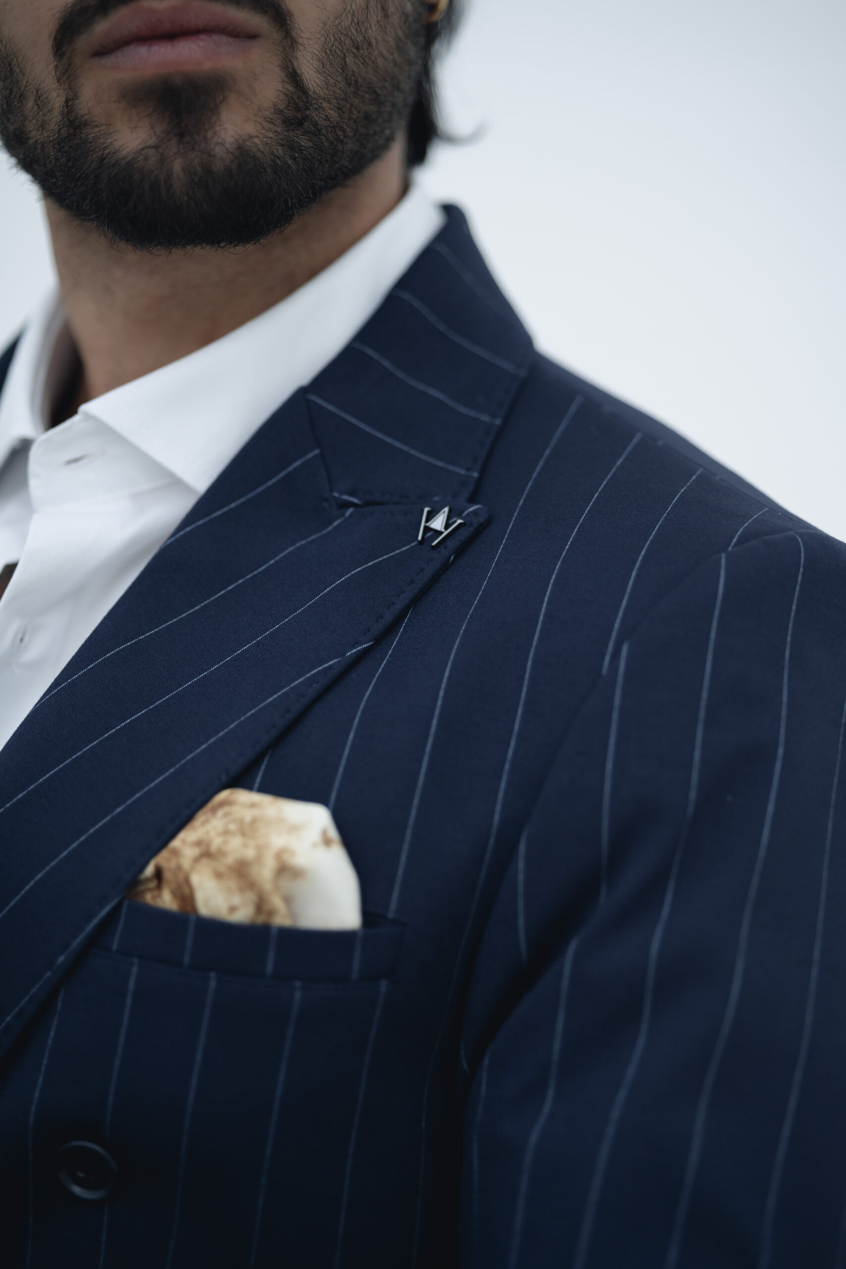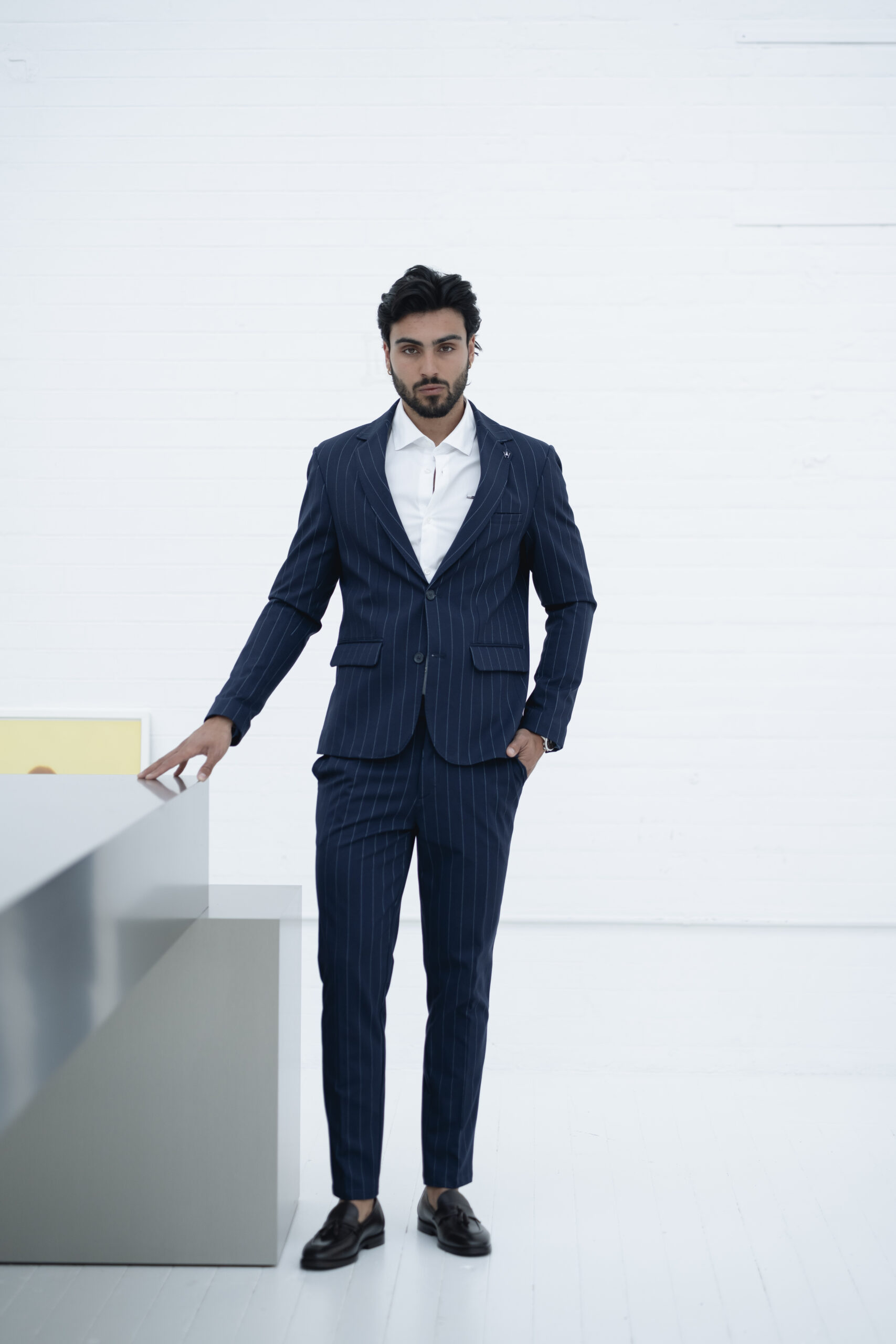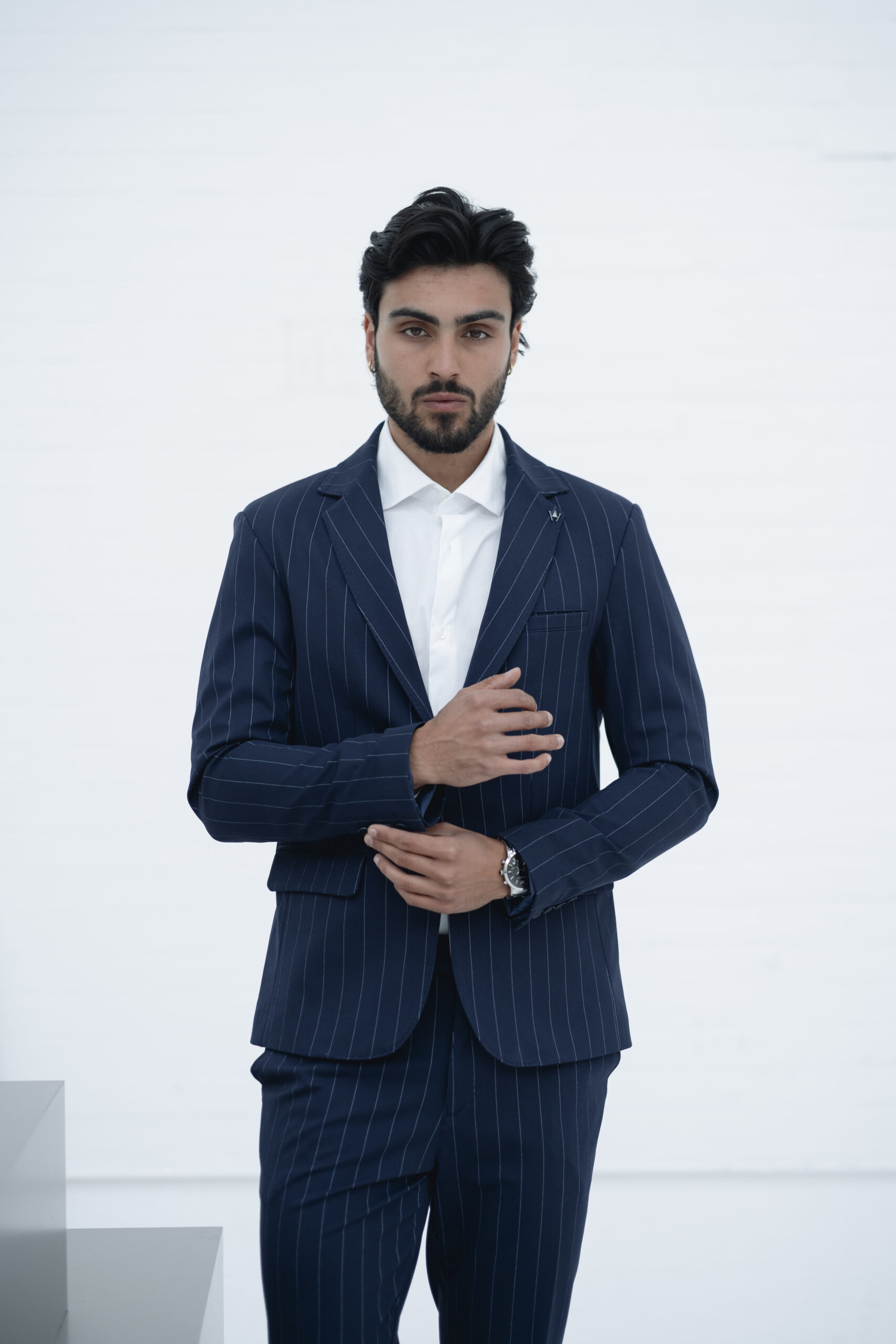 Fato slim fit Azul de risca giz elegante, pensado para homens que querem marcar presença em qualquer ocasião. Ideal para casamentos e eventos formais, combina um design moderno com conforto e ajuste perfeito.