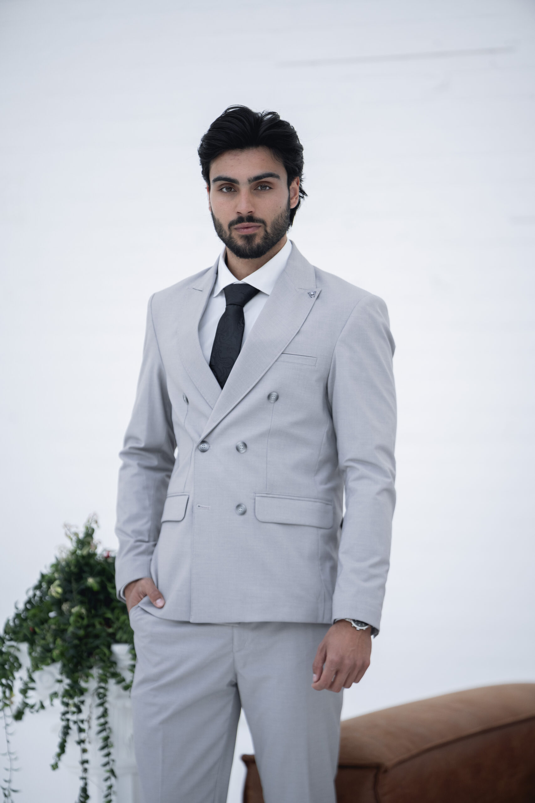 Fato slim fit cinza elegante, pensado para homens que querem marcar presença em qualquer ocasião. Ideal para casamentos e eventos formais, combina um design moderno com conforto e ajuste perfeito.