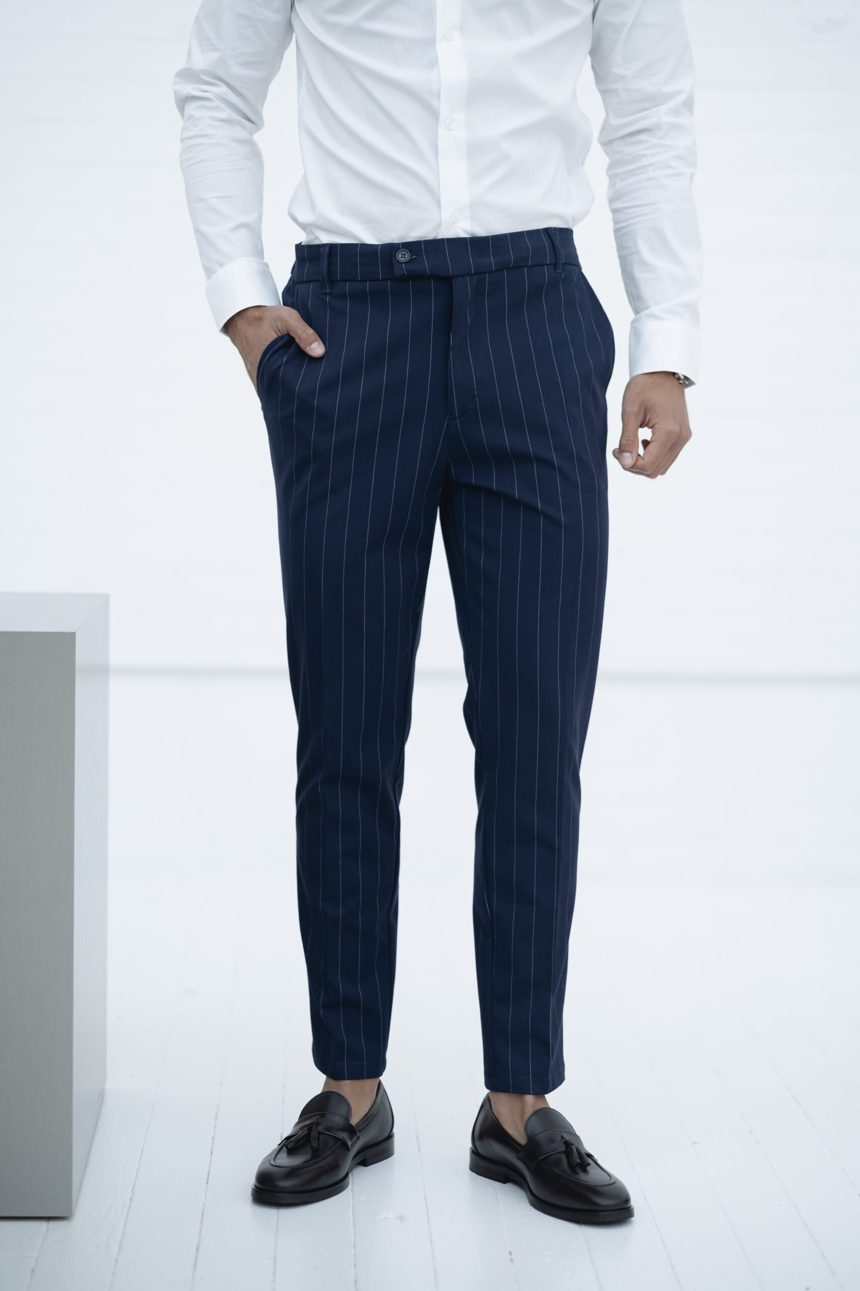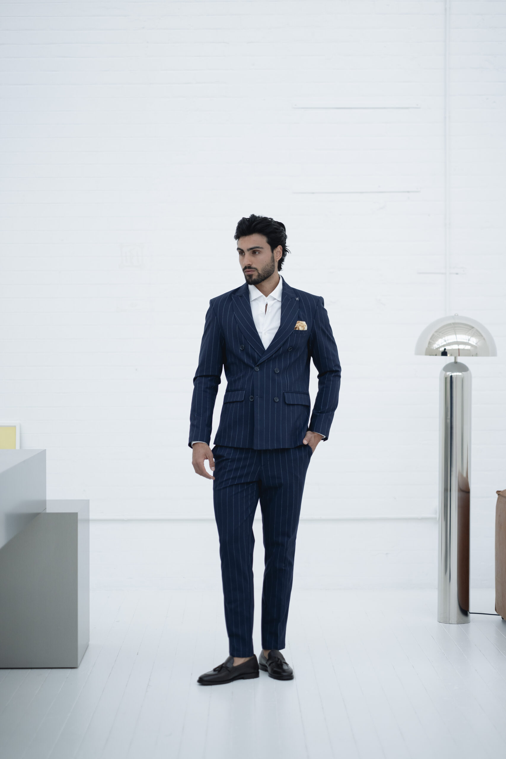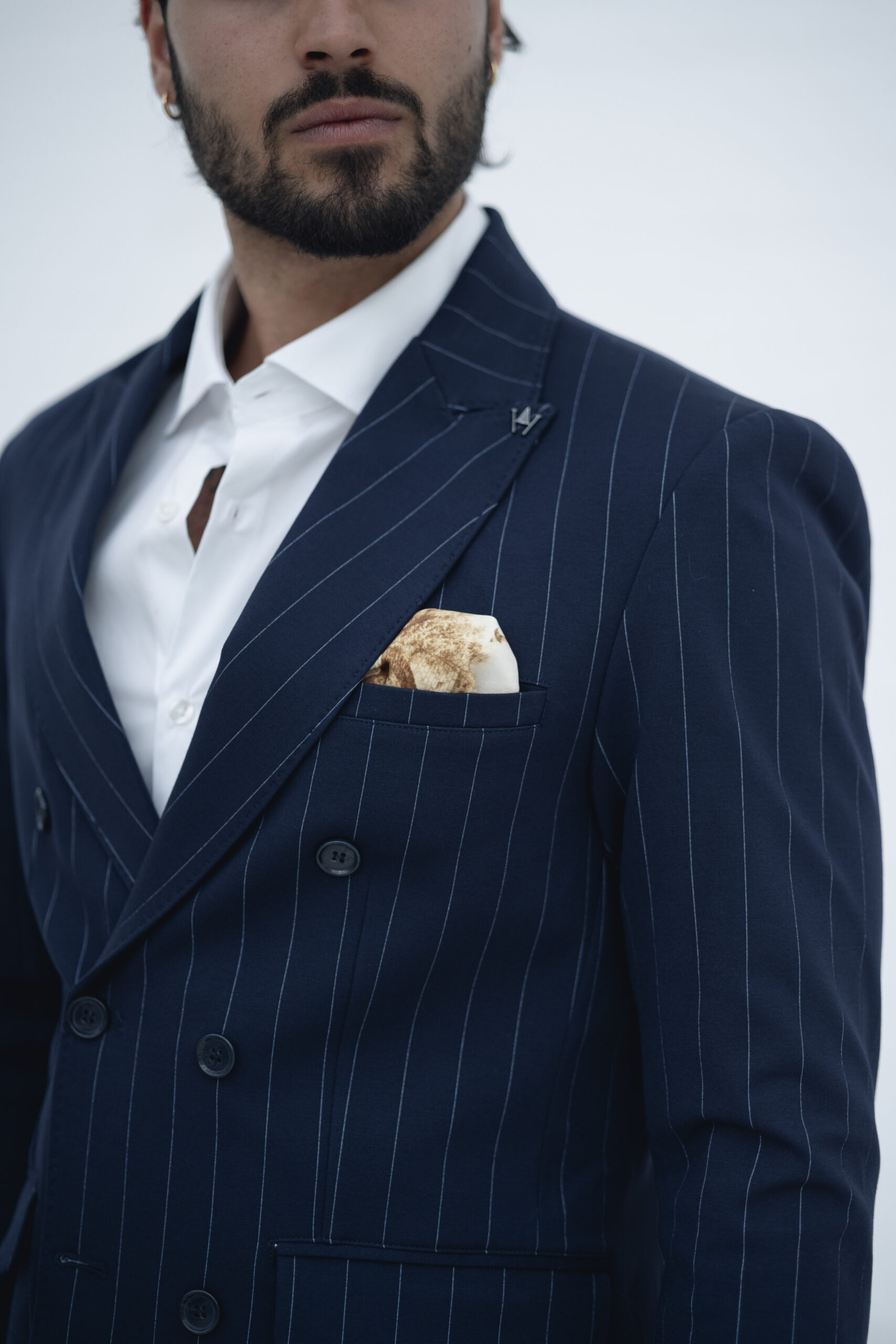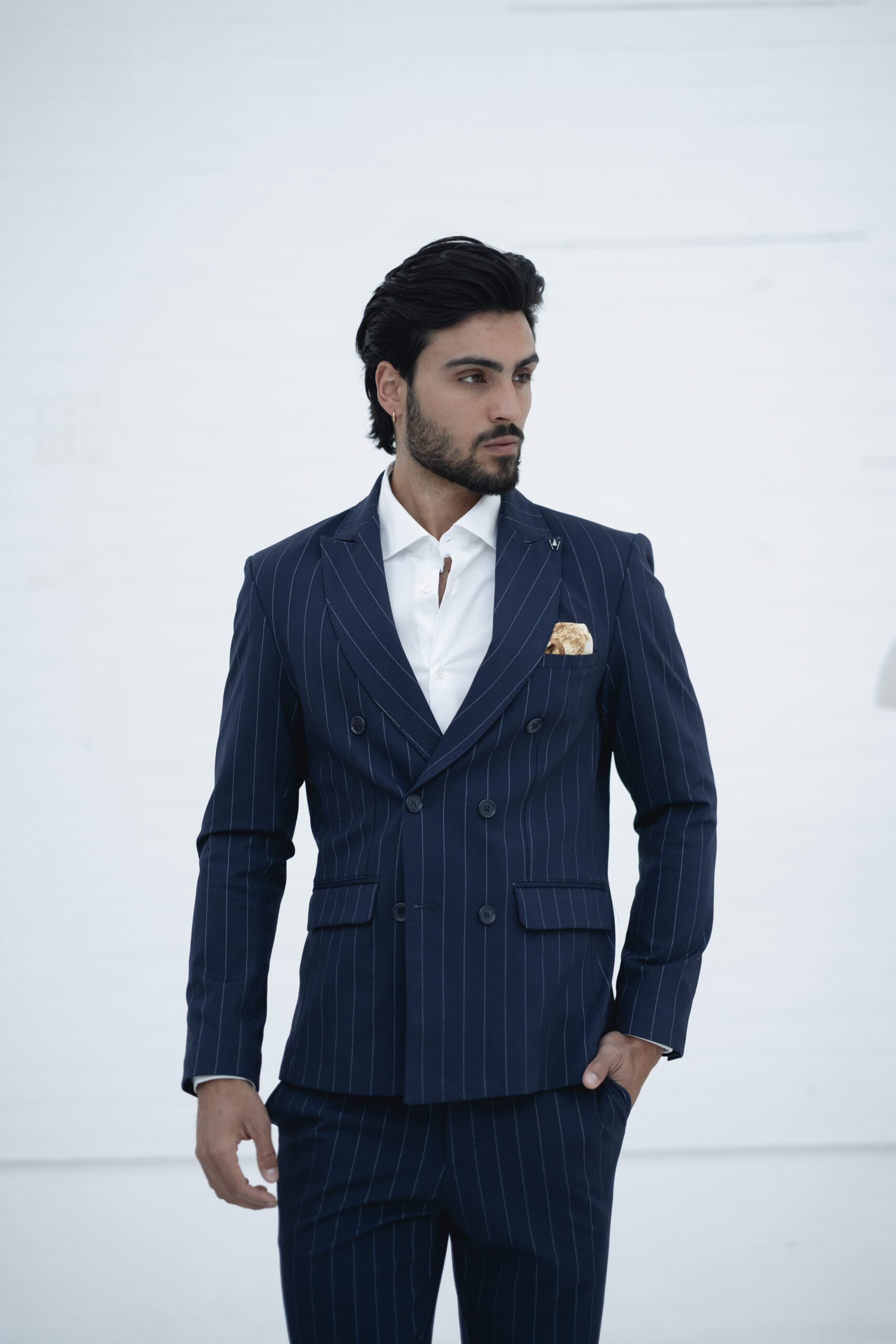Fato slim fit Azul de risca giz elegante, pensado para homens que querem marcar presença em qualquer ocasião. Ideal para casamentos e eventos formais, combina um design moderno com conforto e ajuste perfeito.