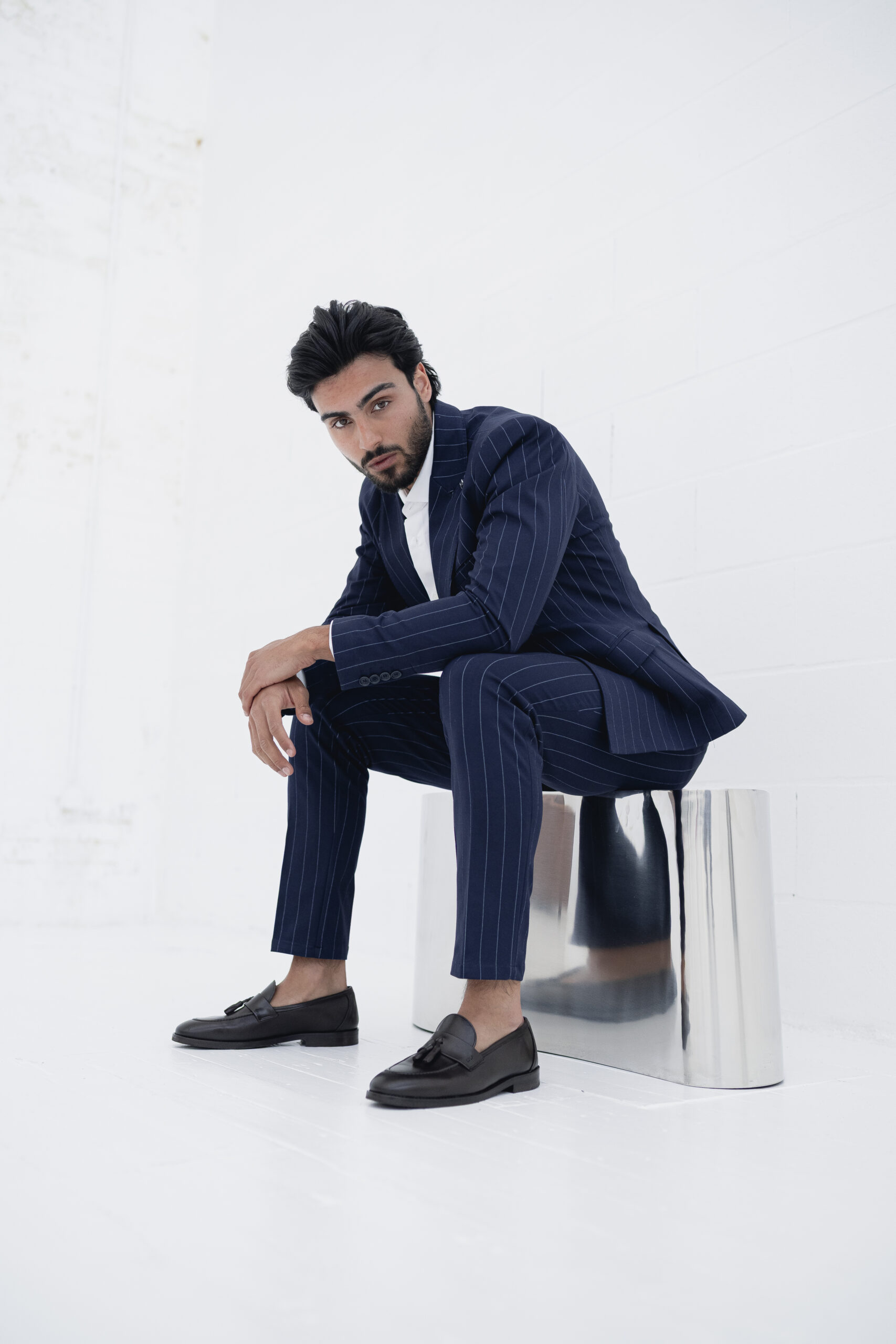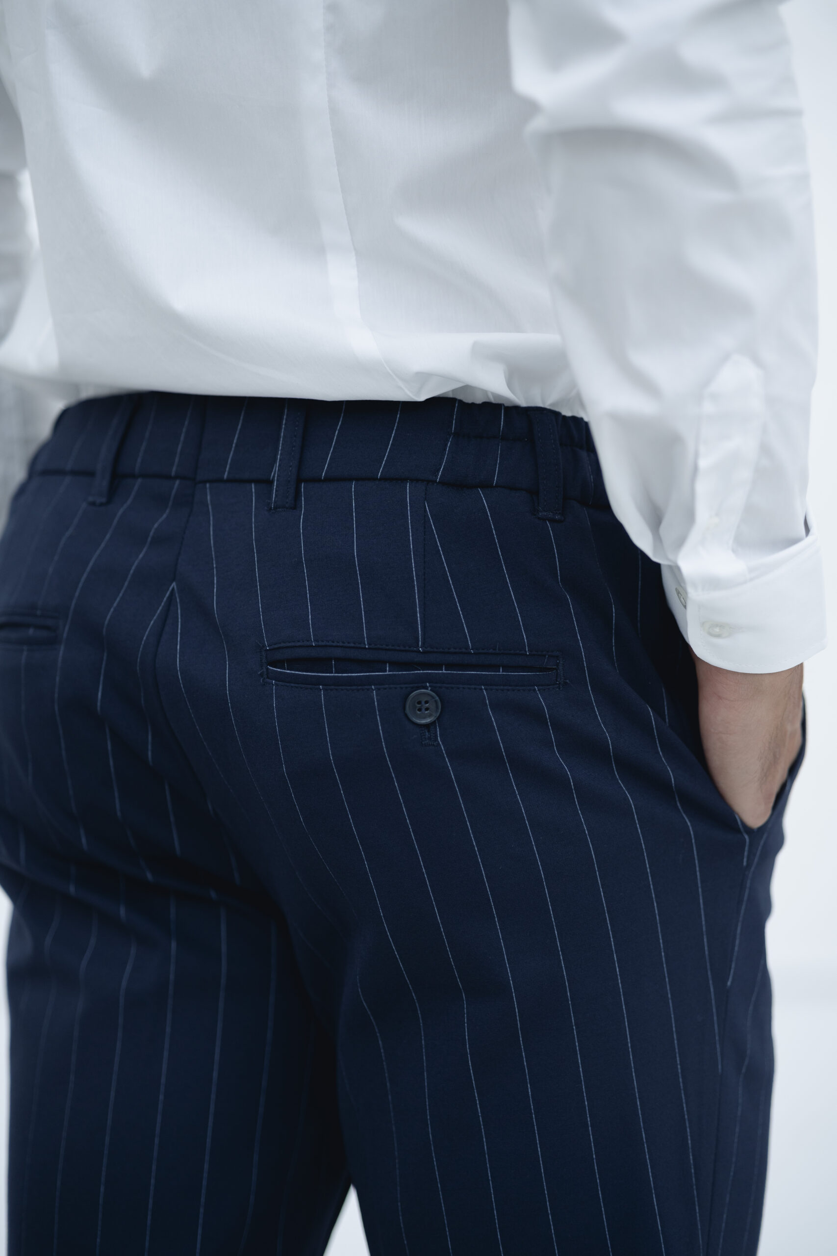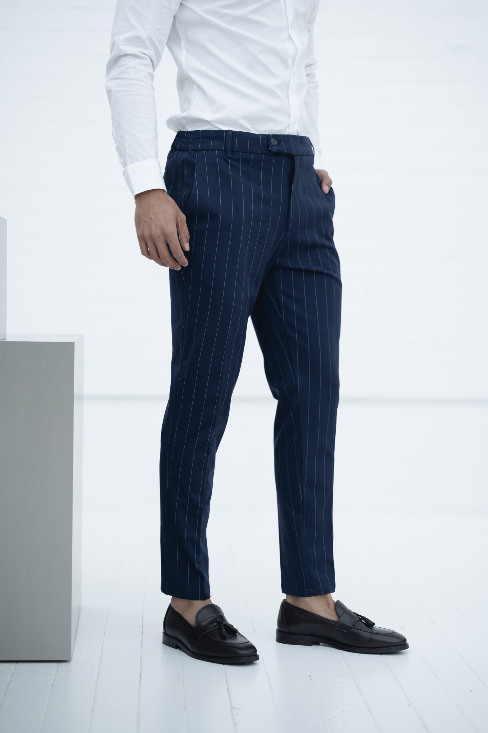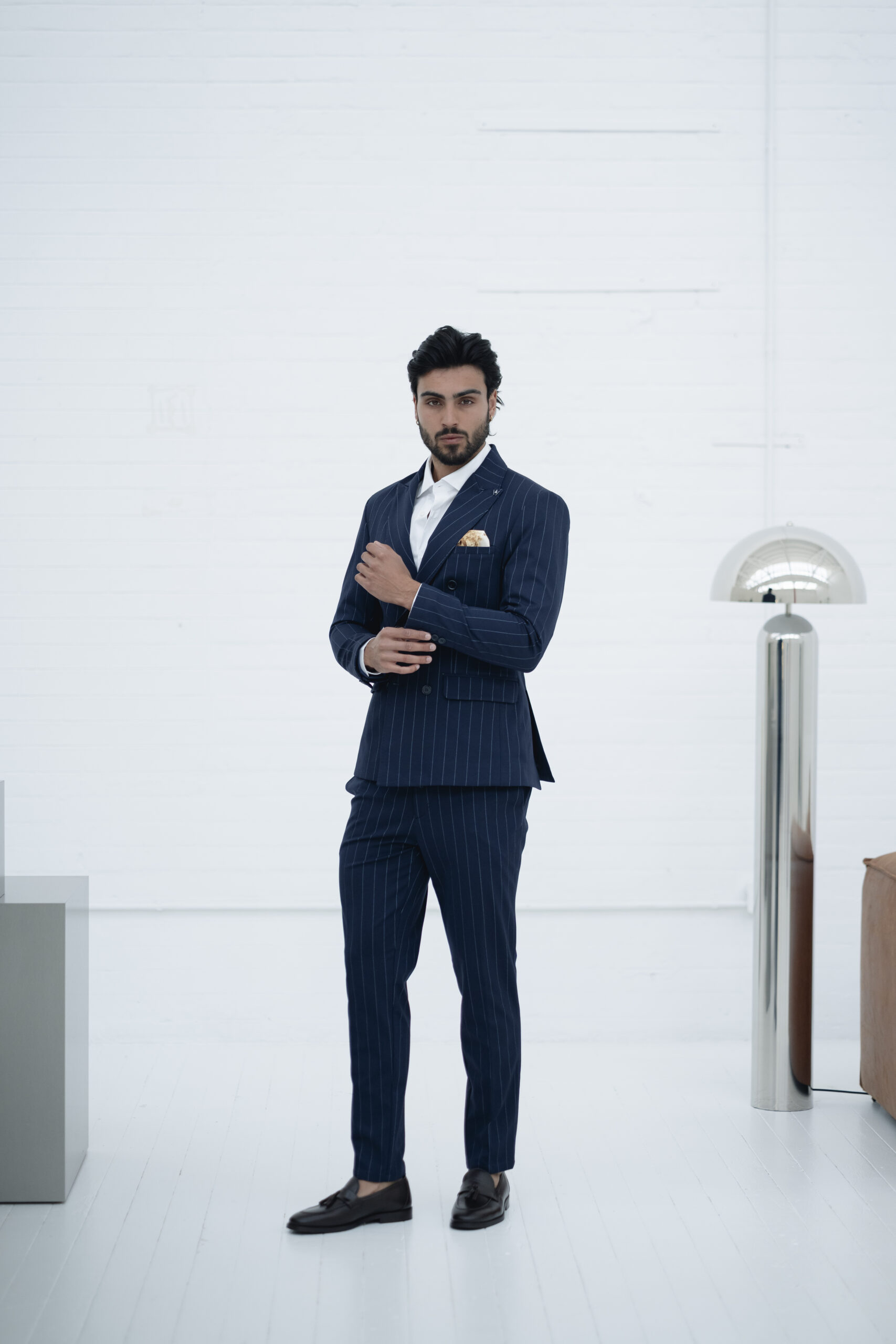 Fato slim fit Azul de risca giz elegante, pensado para homens que querem marcar presença em qualquer ocasião. Ideal para casamentos e eventos formais, combina um design moderno com conforto e ajuste perfeito.