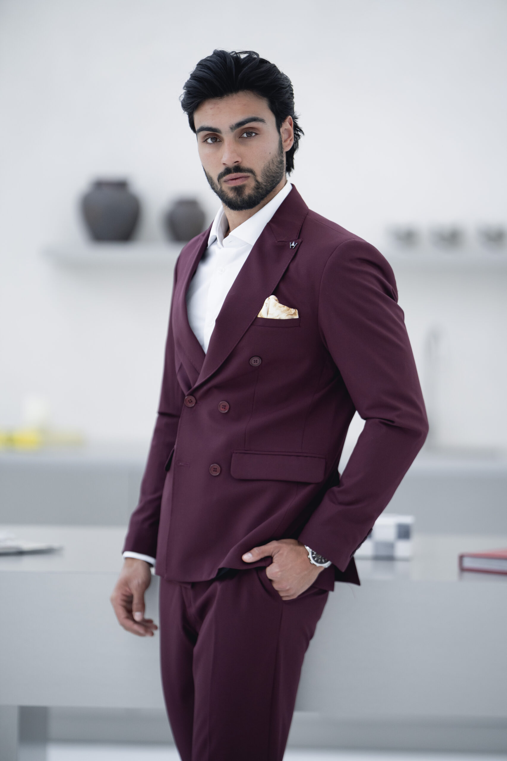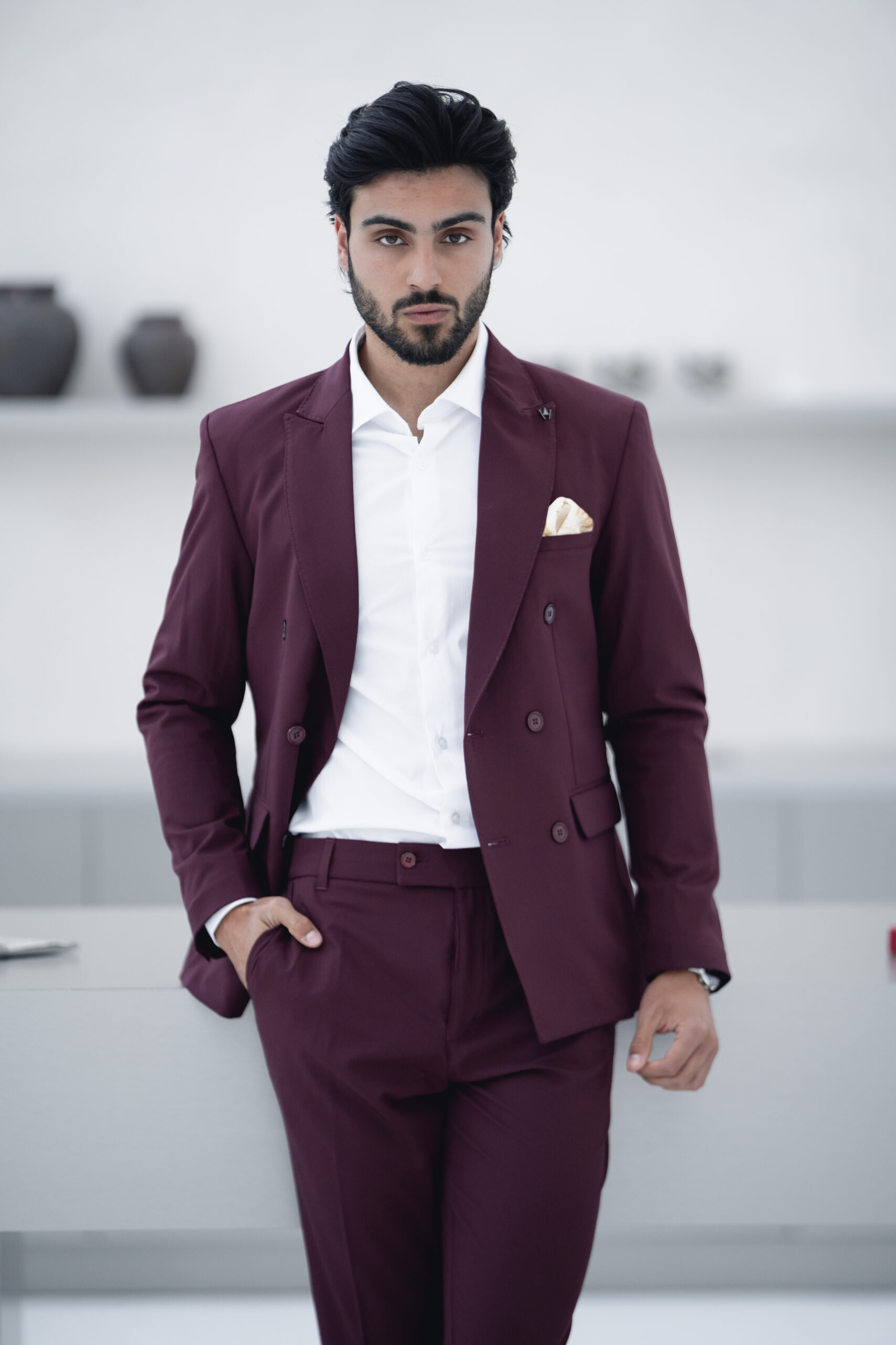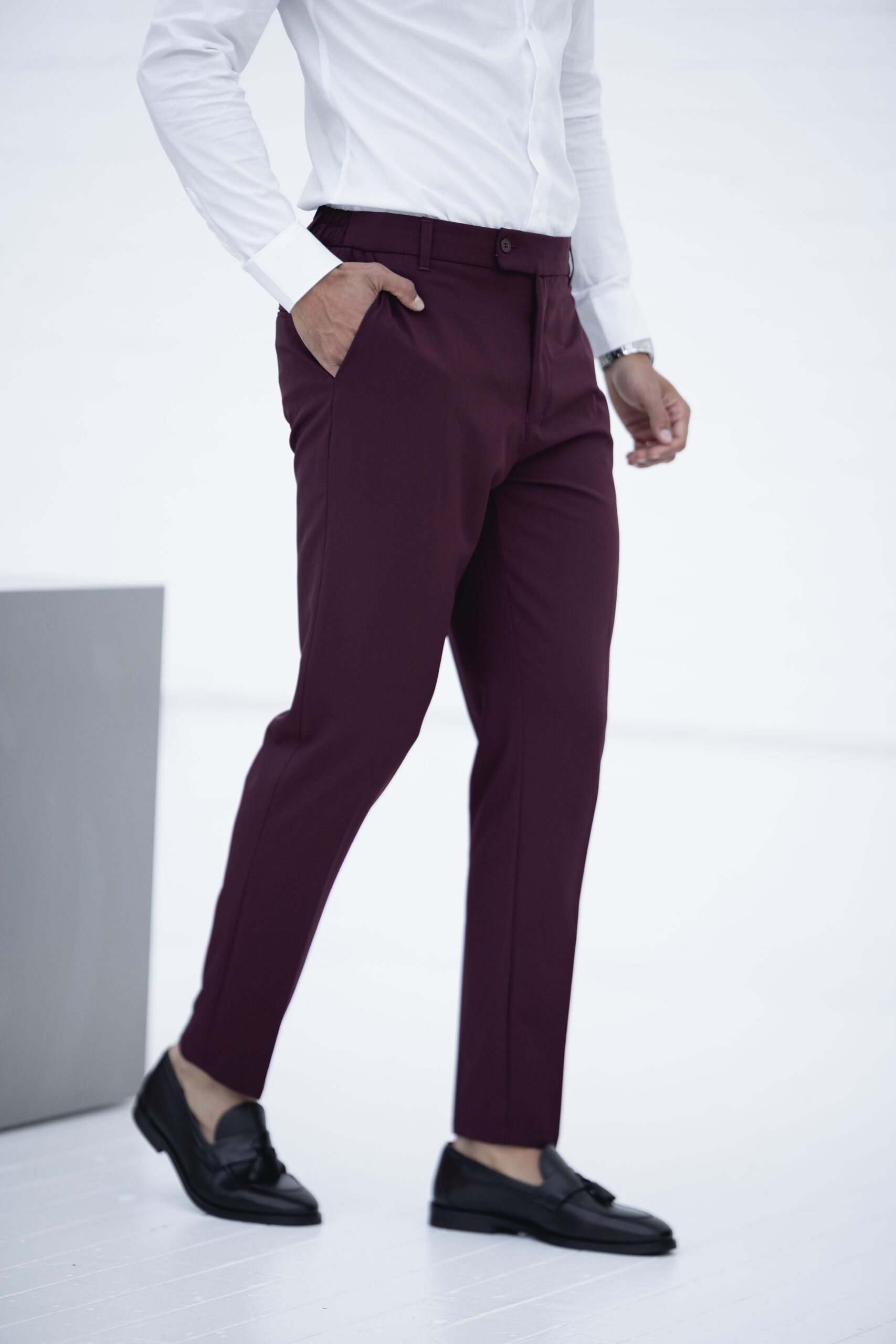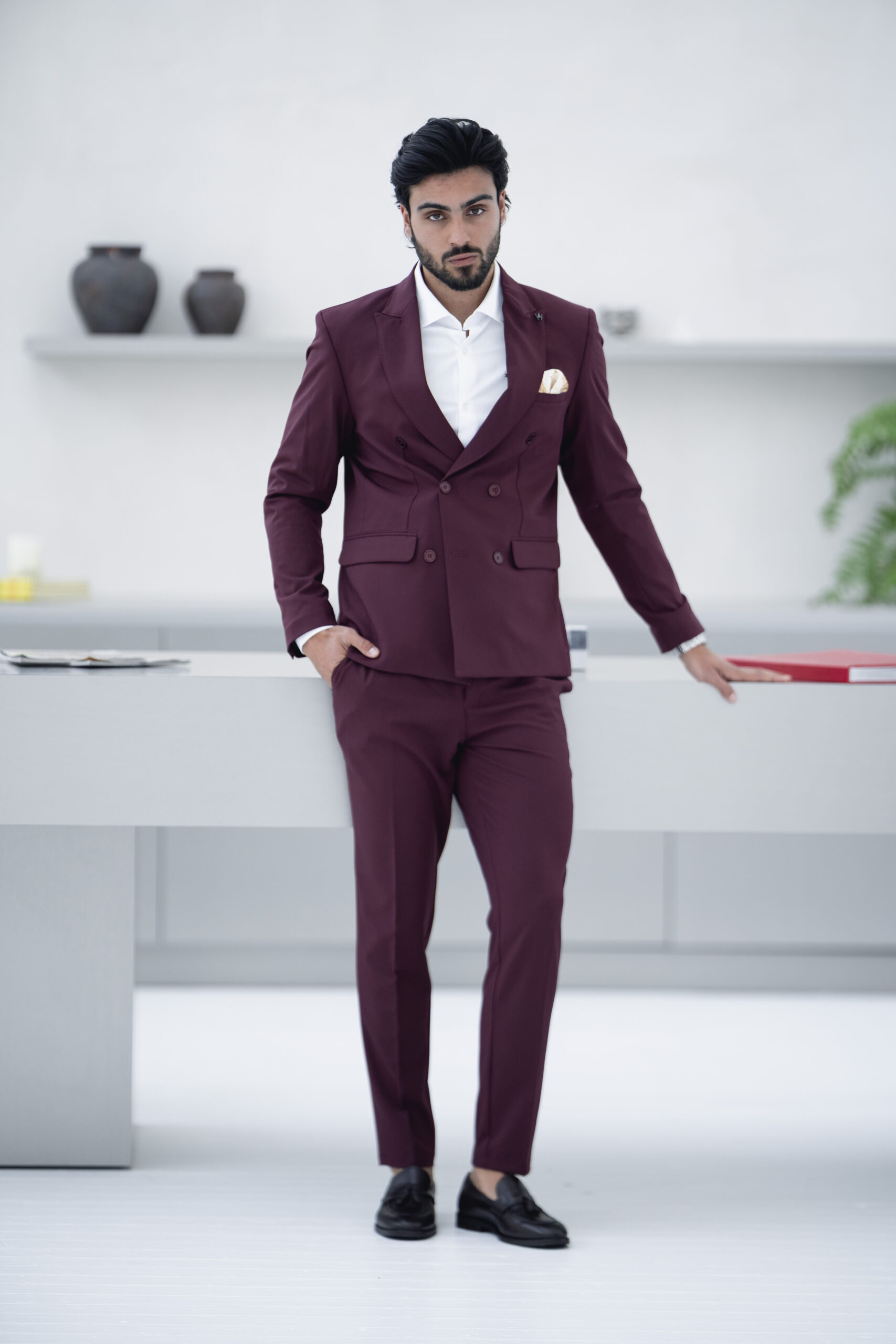 Fato slim fit bordô elegante, pensado para homens que querem marcar presença em qualquer ocasião. Ideal para casamentos e eventos formais, combina um design moderno com conforto e ajuste perfeito.
