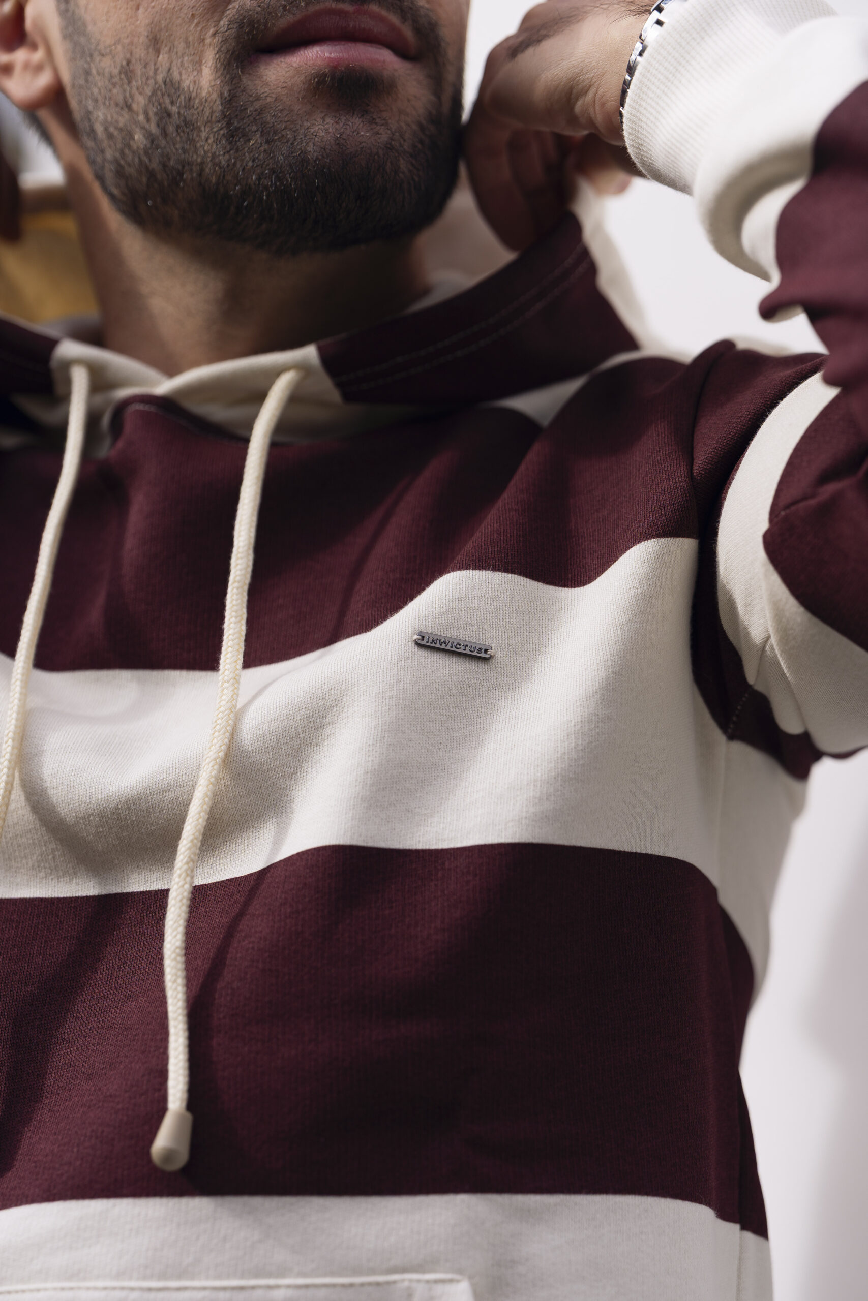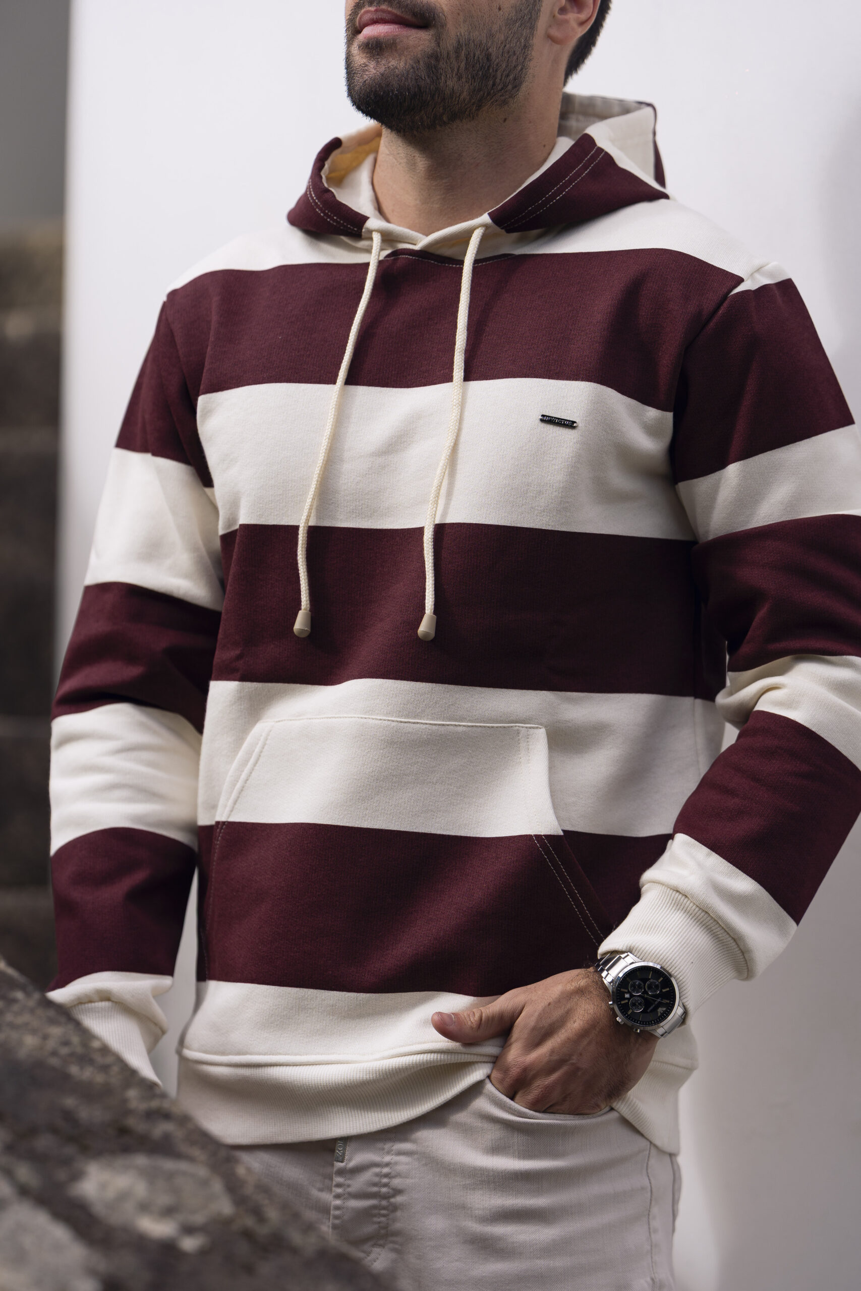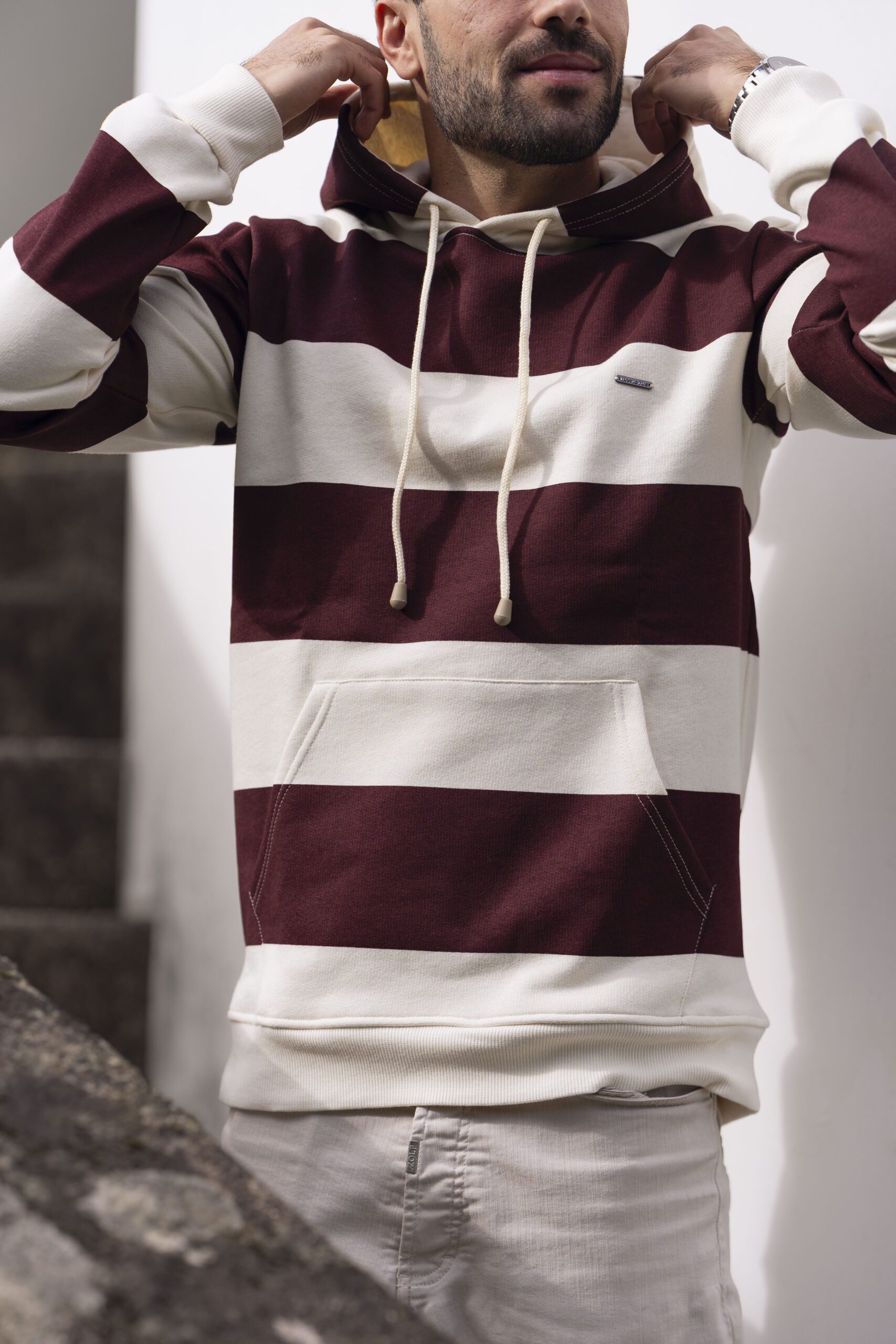 Hoodie de riscas horizontais em bordô e cru, ideal para o dia-a-dia. Apresenta capuz com cordões, bolso frontal e um toque suave que garante conforto em qualquer ocasião.