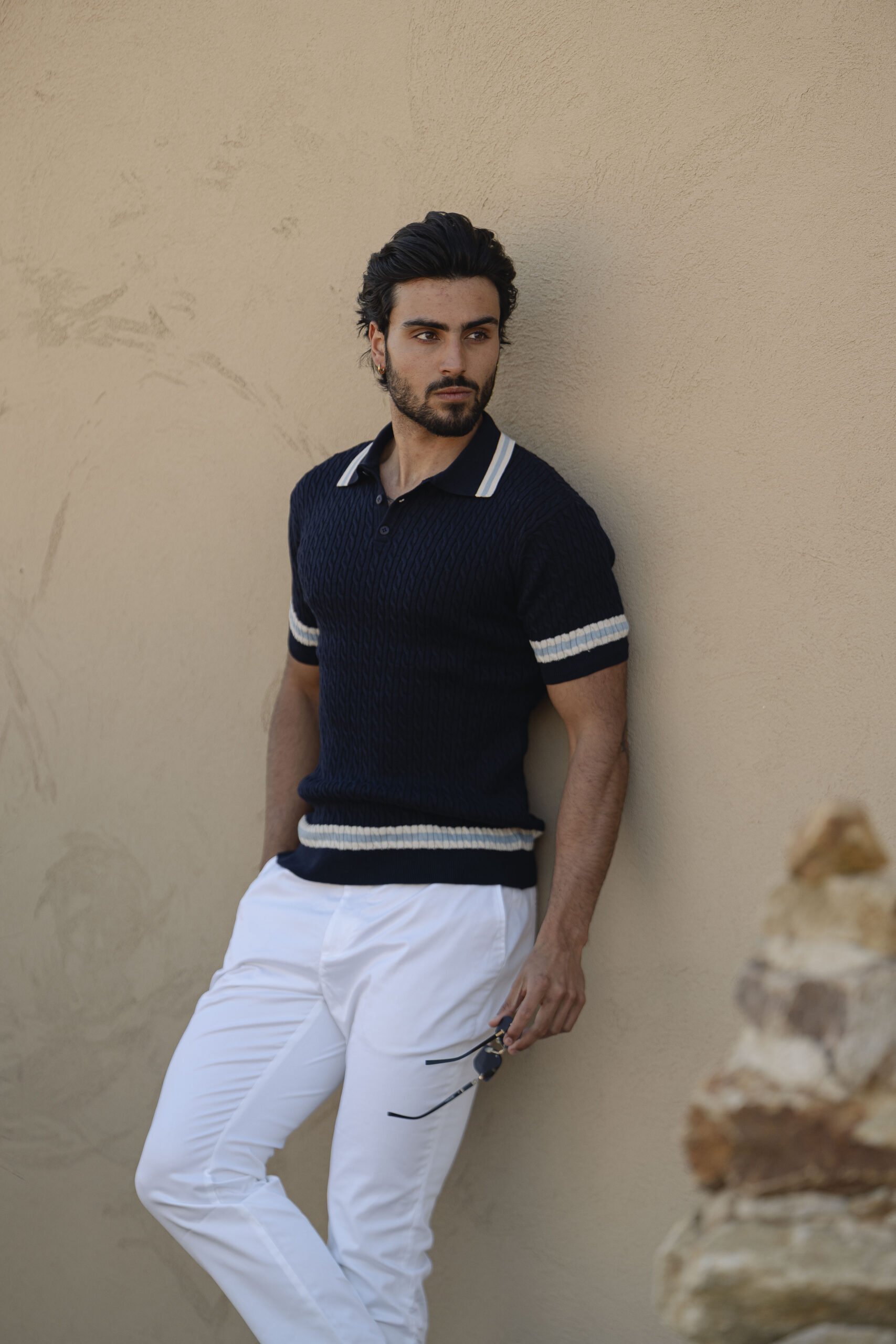 Inspirado no estilo clássico da Riviera Europeia, o Polo Tricot Entrançado Azul combina sofisticação intemporal com conforto contemporâneo.