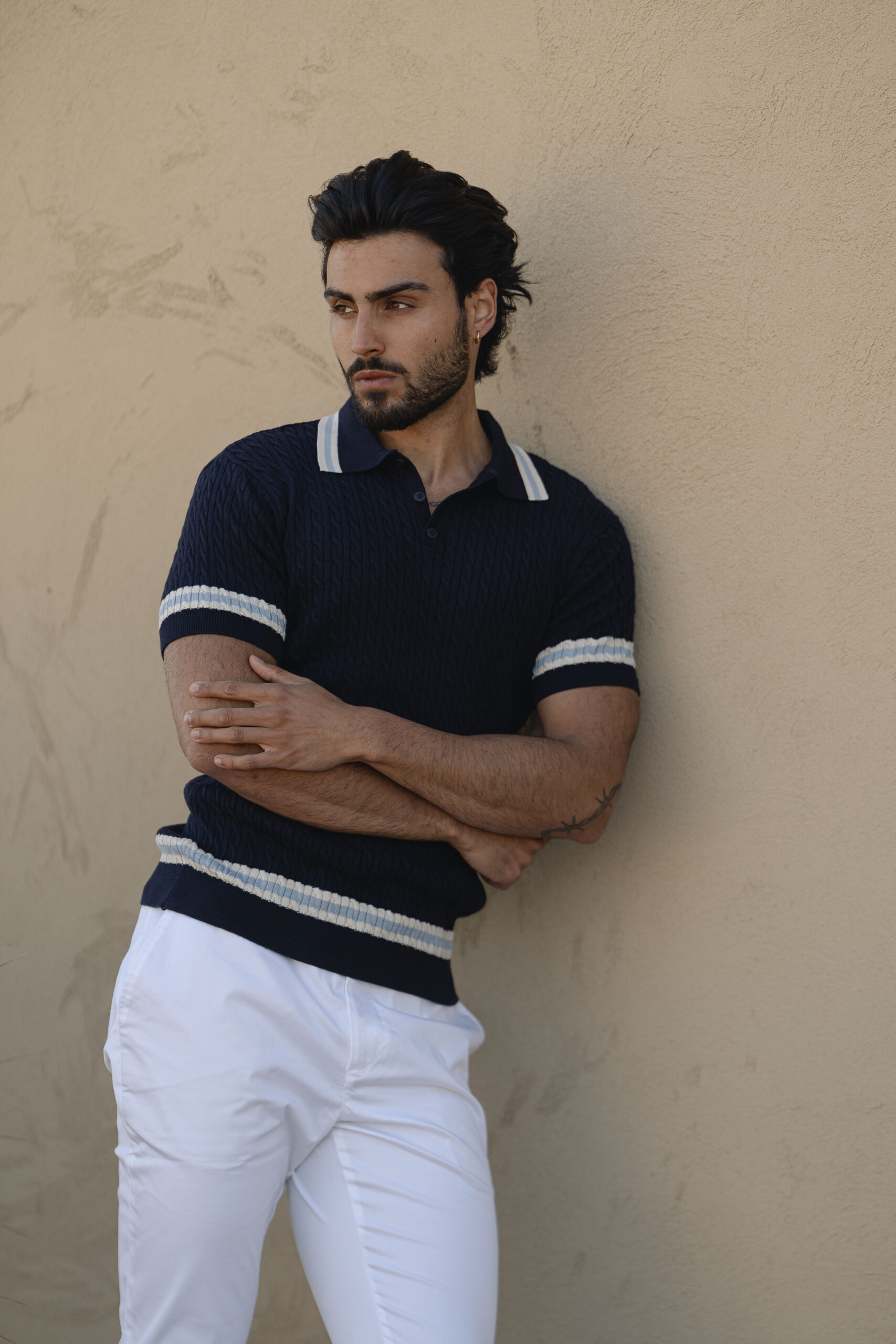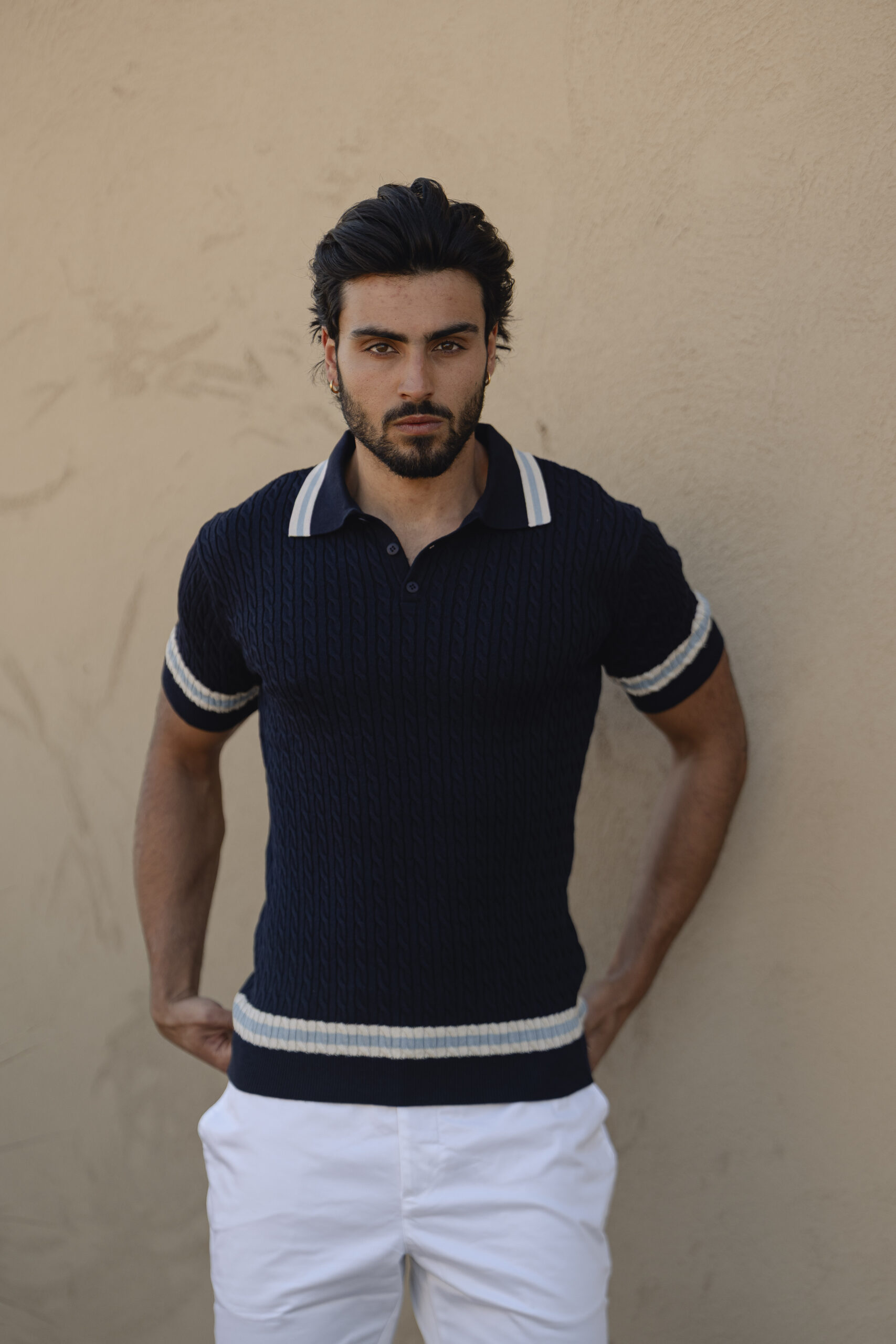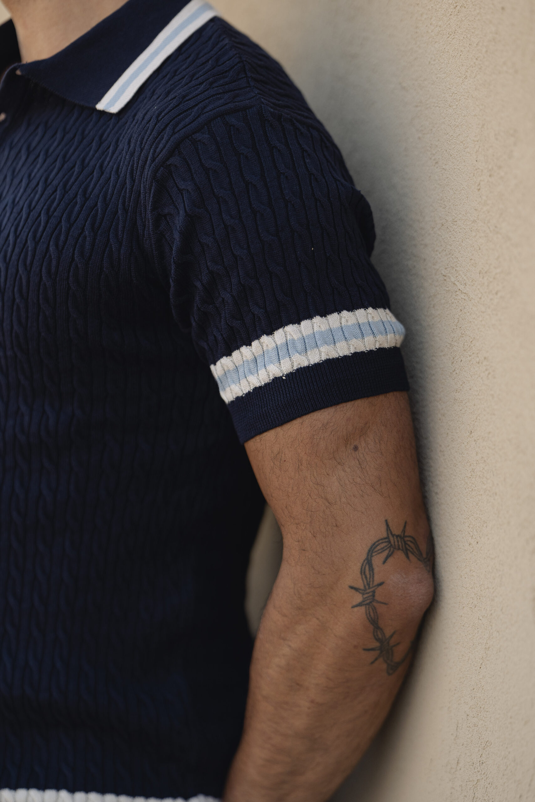 Polo tricot creme com detalhes Azuis e textura entrançada, pensado para homens que procuram elegância sofisticada e conforto premium nos dias de verão.