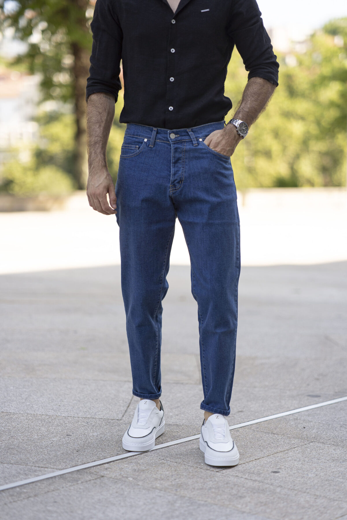 O corte tapered oferece um equilíbrio entre conforto e estilo refinado. Com uma linha mais solta na parte superior e afunilada na perna, este modelo traz leveza e modernidade ao visual diário.